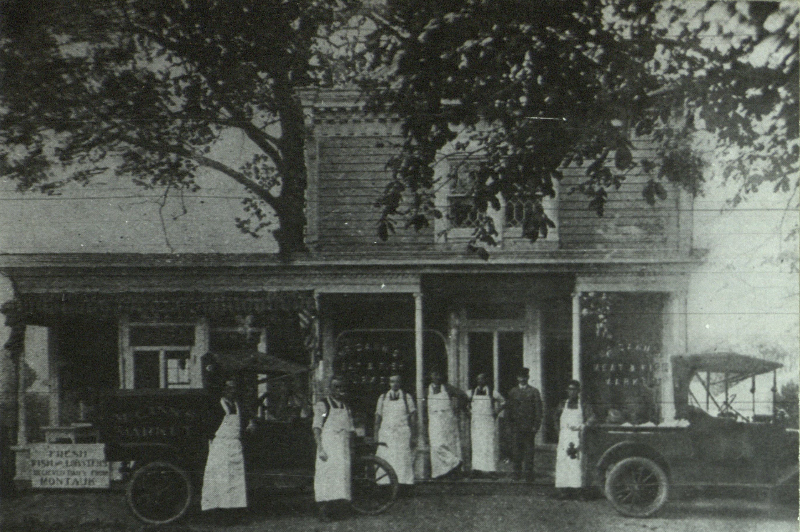 Caption on reverse reads: McCann's Meat and Fish Market. This store stood by the sidewalk directly in front of the present easterly extension to Guild Hall. Some distance back from the store in about the center of what is now Pond View Lane stood the smoke house where home cured hams and bacons were prepared. Copy by C. Frank Dayton.