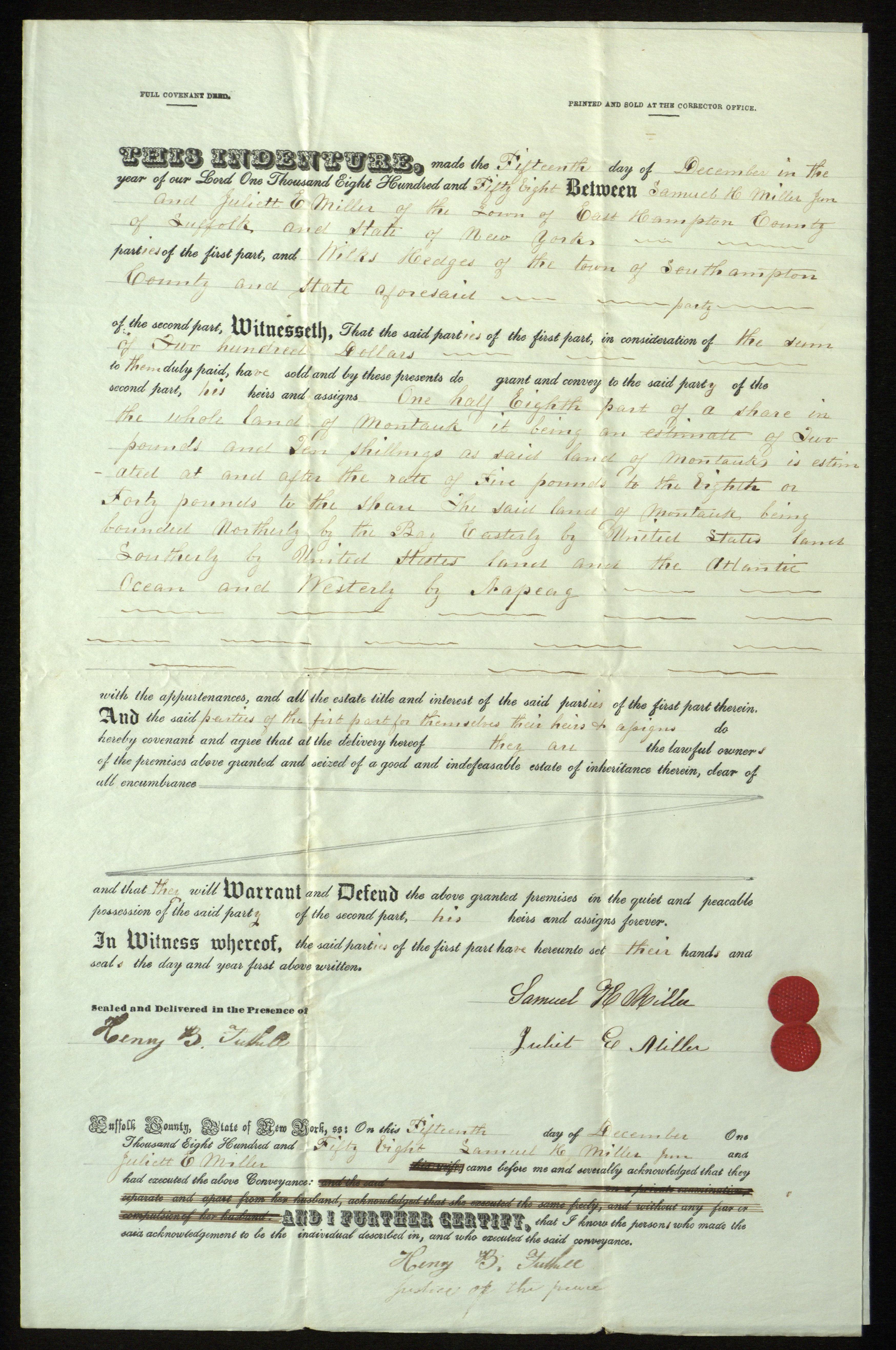 Deed for one half eigth, part of a share of land, located in Montauk, N.Y., December 15, 1858.