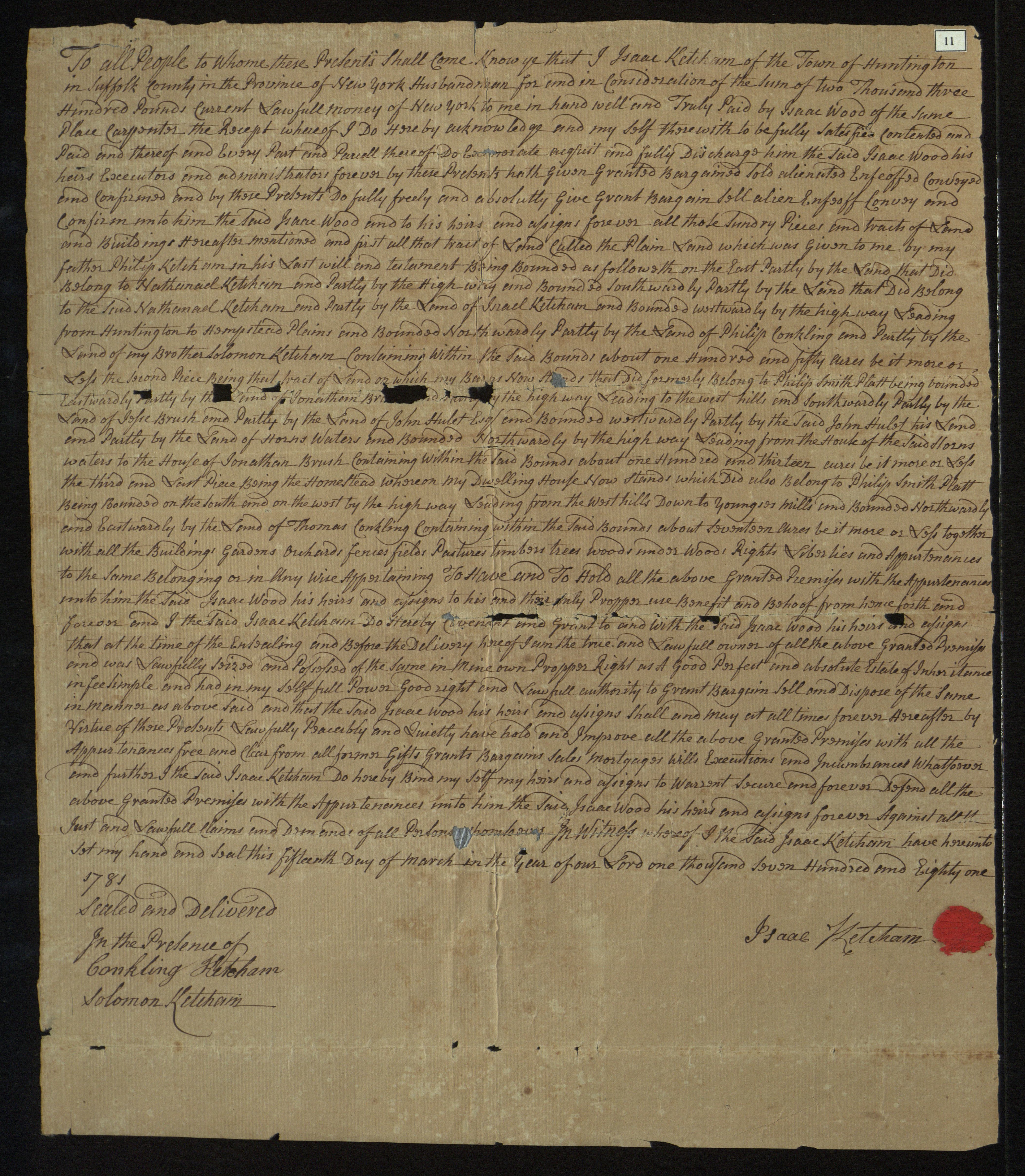 Sale of 3 parcels in Huntington Township, N.Y., including tract called "The Plain Land," [on the northern edge of the Hempstead Plains] by Isaac Ketcham, husbandman, to Isaac Wood, carpenter, both of Huntington Township, N.Y.; March 15, 1781. First parcel, 150 acres, known as "The Plain Land," bounded on the west by highway leading from Huntington to [The] Hempstead Plains; second parcel, 113 acres where [Ketcham's] barns now stand, bounded on the east by the highway leading to the West Hills [in Huntington Township]; and third parcel, 17 acres where [Ketcham's] dwelling house stands, bounded on the south and west by highway leading from the West Hills down to Youngs' Mills; witnessed by Conkling Ketcham and Solomon Ketcham.