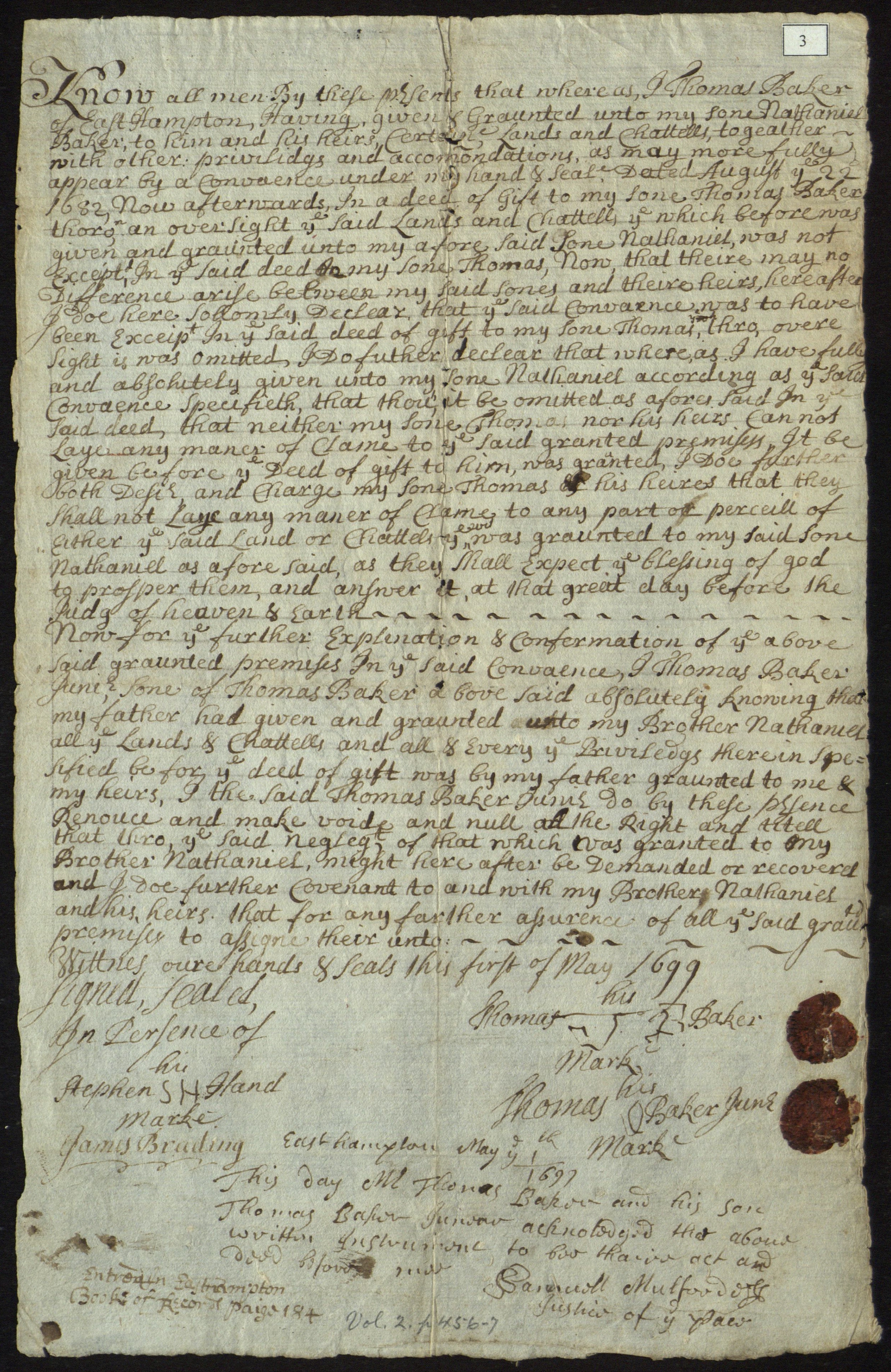 Statement made by Thomas Baker to correct an error in deed of gift of lands and chattel to his son Thomas Baker Jr., East Hampton Township, N.Y., May 1st, 1699. Clarification made by Thomas Baker in regard to lands and chattel he gave to son Nathaniel, accidentally omitting son Thomas Jr.; witnessed by Stephen Hand and James Brading. See vol. 2 of E.H. Town Records, pp. 456-7 for transcription [original book of records p. 184].