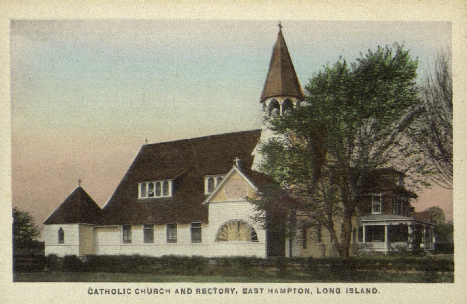 Postcard image of St. Philomena Catholic Church and Rectory, in East Hampton, Long Island