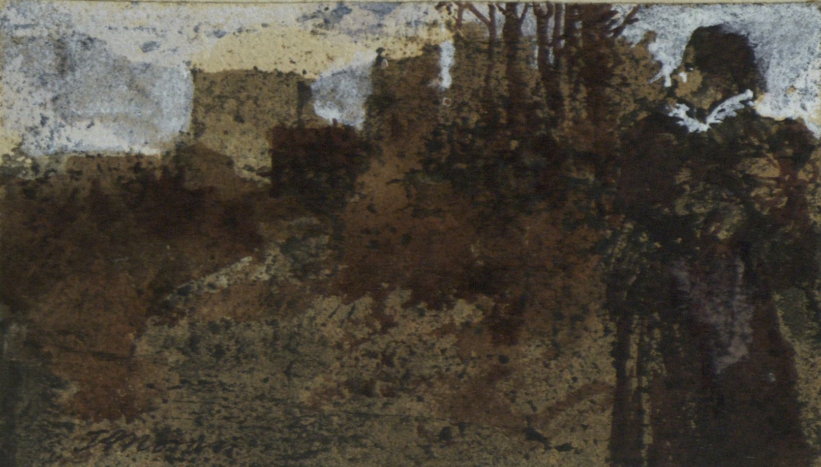 Original signed, small scale ink drawing, with person standing in foreground looking off in the distance, structures in background, by Thomas Moran.