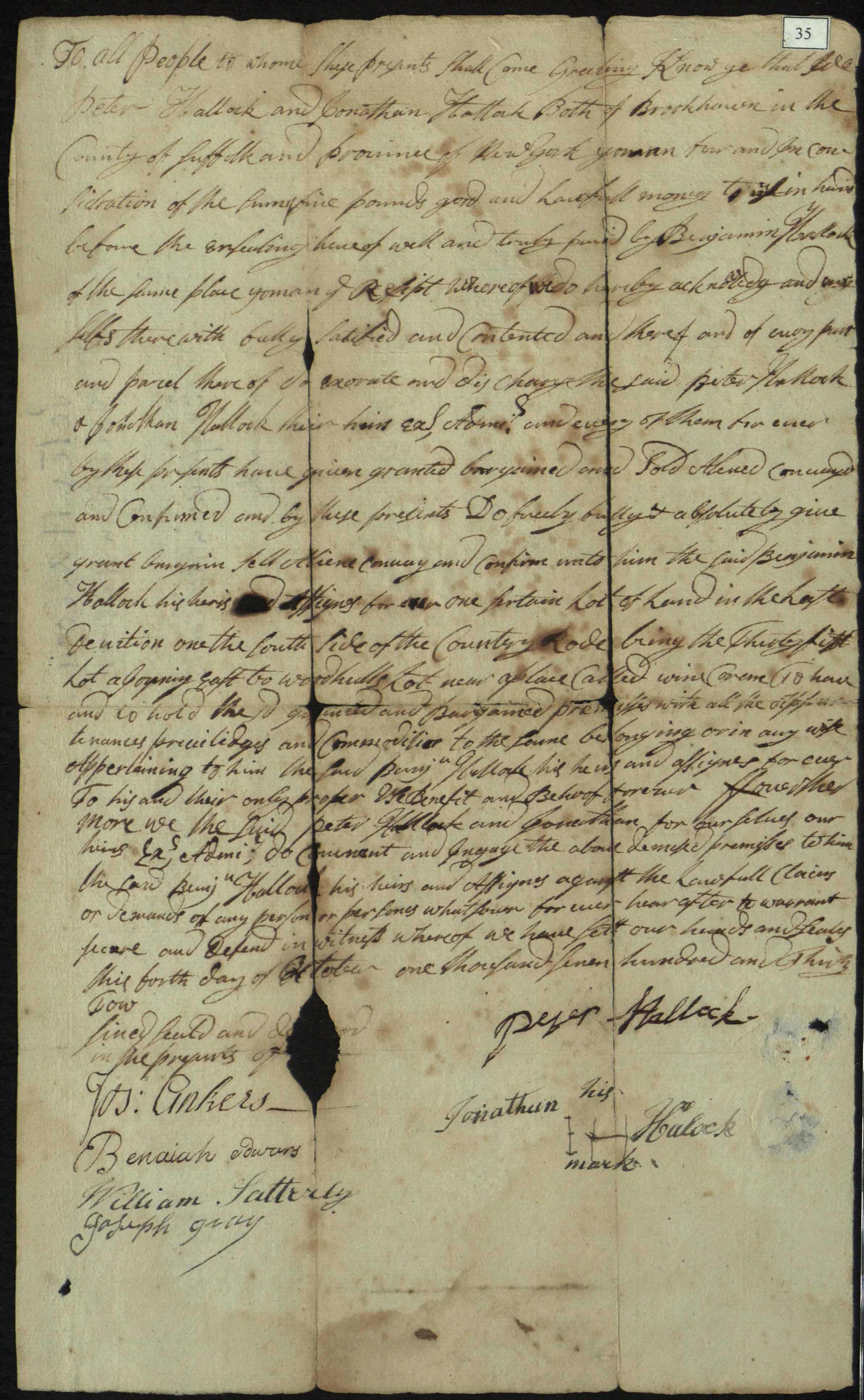 Sale of parcel of land, at Wincoram [Coram], in Brookhaven Township, N.Y., by Peter Hallock, yeoman, and Jonathan Hallock, yeoman, to Benjamin Hallock, yeoman; October 4, 1732. Lot 35 (unspecified quantity) in the last division on the south side of the Country Road; witnessed by Joseph Ankers, Benaiah Powans, William Satterly, and Joseph Gray.