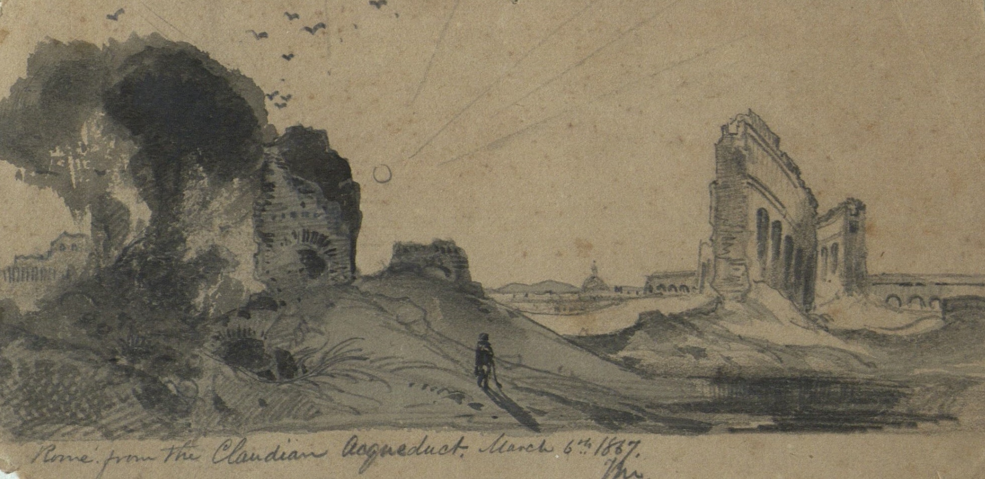 Original pencil and ink stain sketch of Rome, looking from the Claudian Acqueduct, by Thomas Moran.