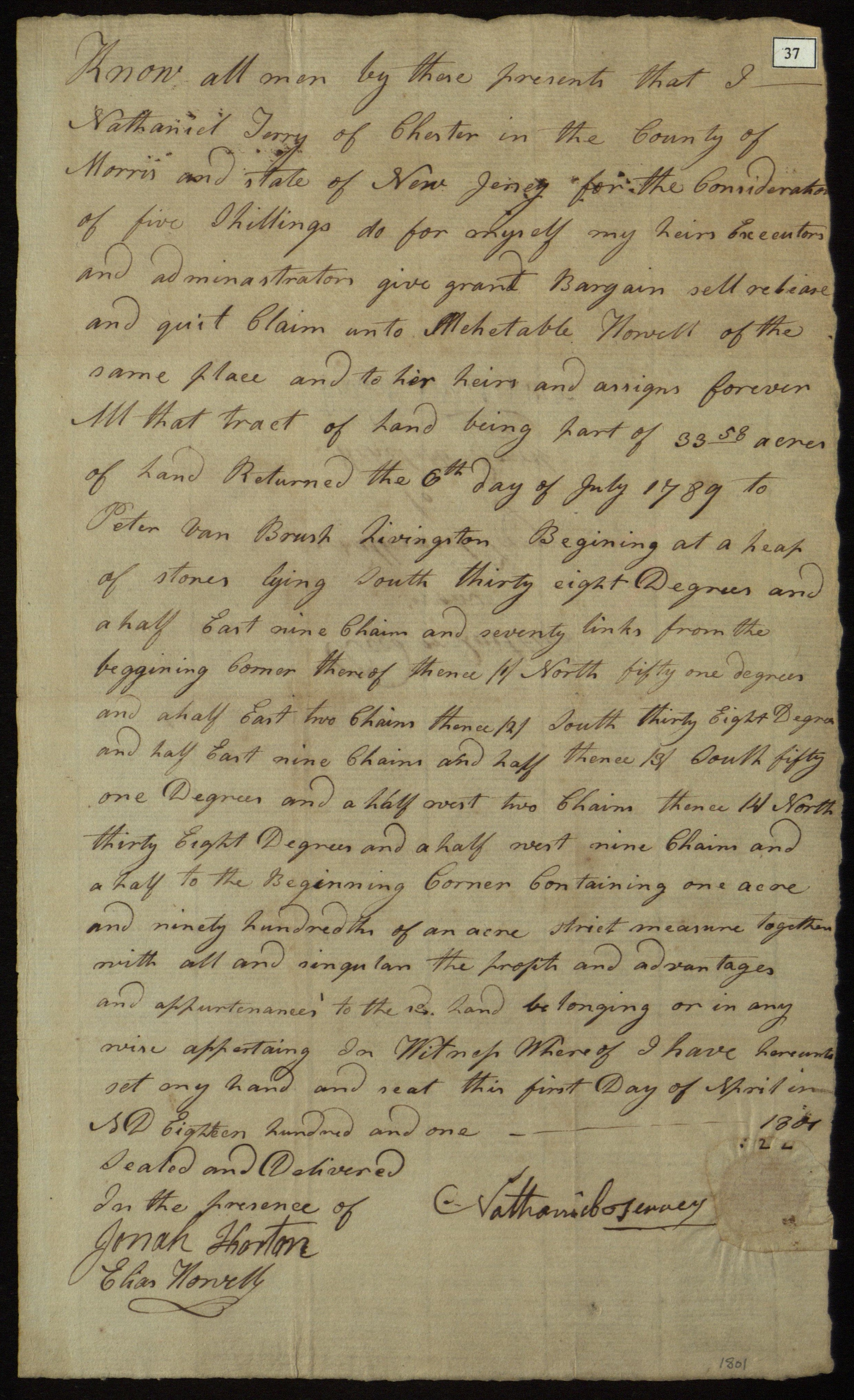 Nathaniel Terry's deed to Mehitable Howell, land located in Chester, in the County of Morris, New Jersey, 1801.
