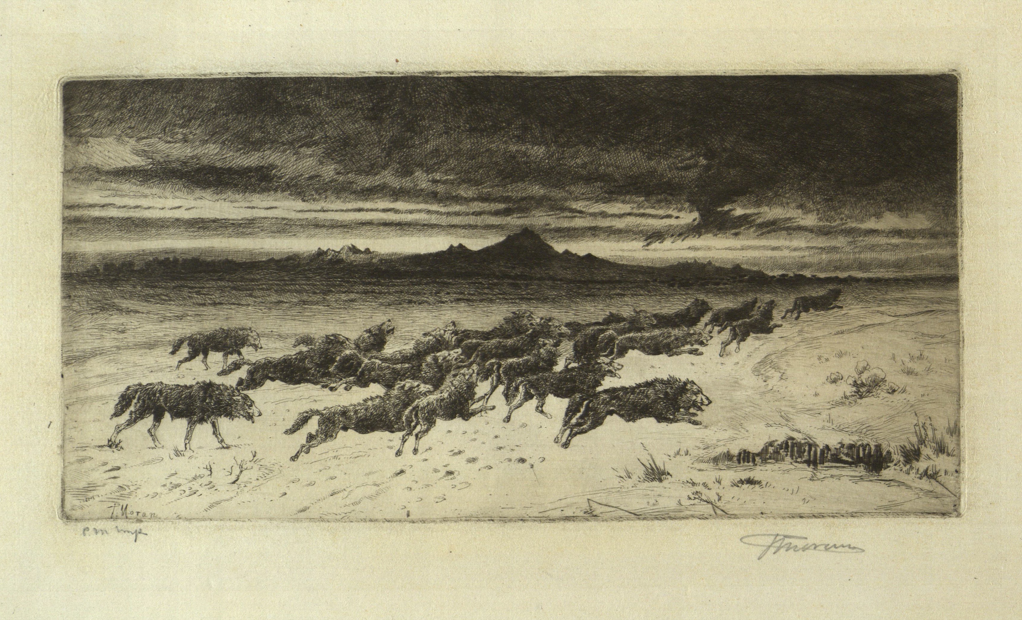 Original etching of a pack of wolves running on the open land, by Peter Moran.
