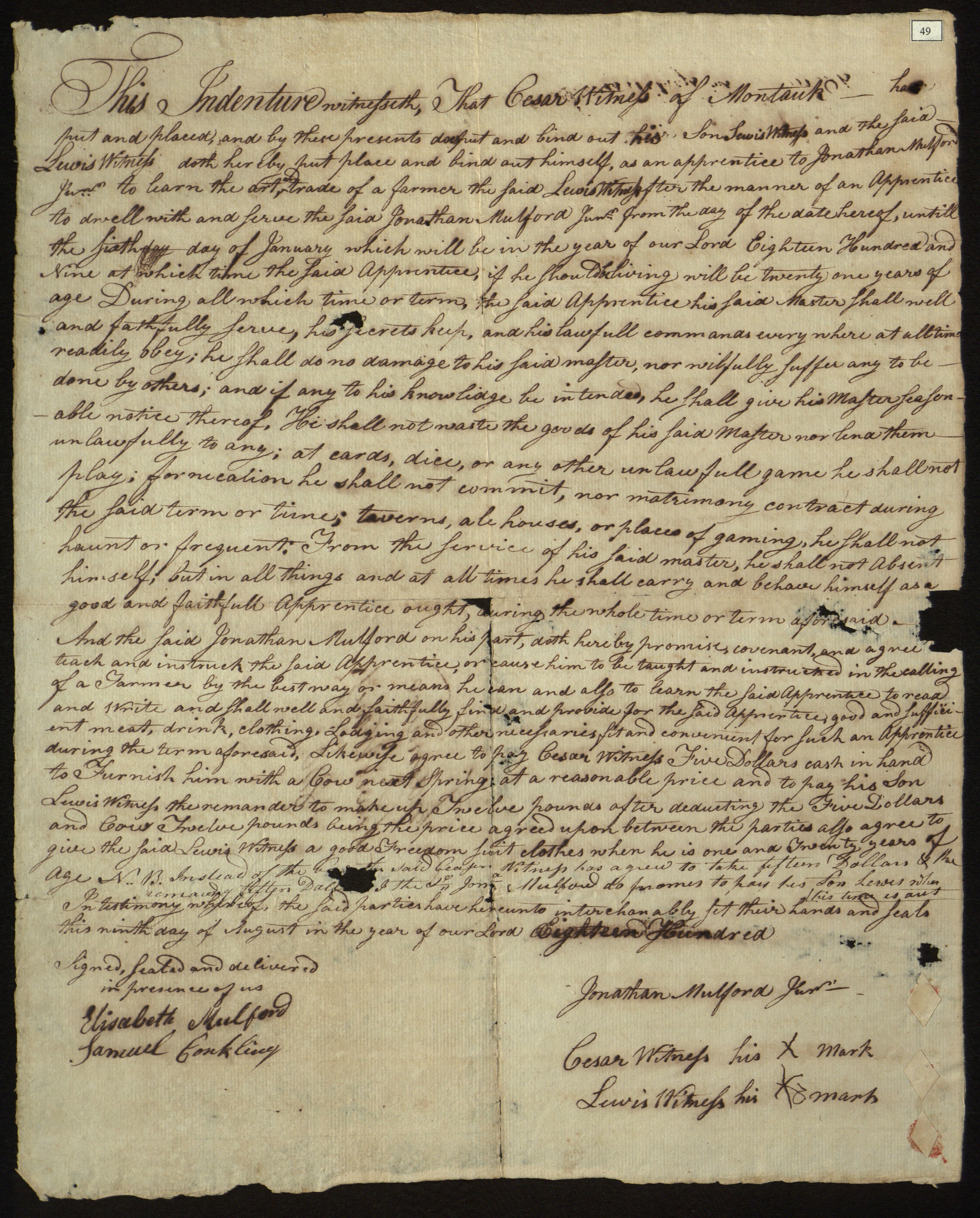 Apprenticeship of Lewis Witness, of Montauk, N.Y., to Jonathan Mulford, Jr., by father Cesar Witness, East Hampton Township, N.Y., August 9, 1800. Contract between Cesar Witness, of Montauk, N.Y., and Jonathan Mulford Jr., of East Hampton, N.Y., binding Witness's son, Lewis Witness, to learn the trade of farmer; witnessed by Elizabeth Mulford and Samuel Conkling.