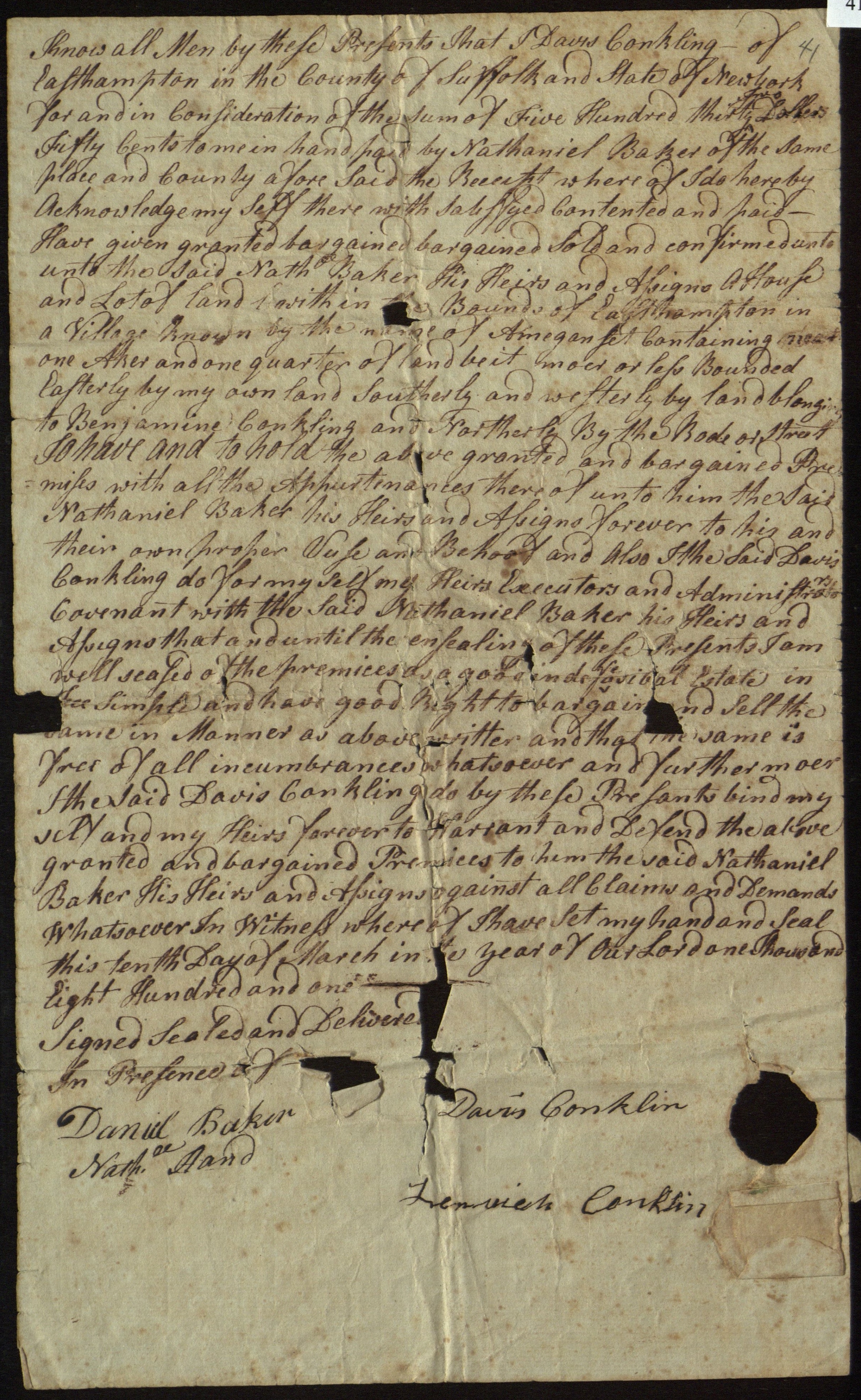 Deed for 1/4 acre of land, located in Amagansett, N.Y., March 10, 1801.