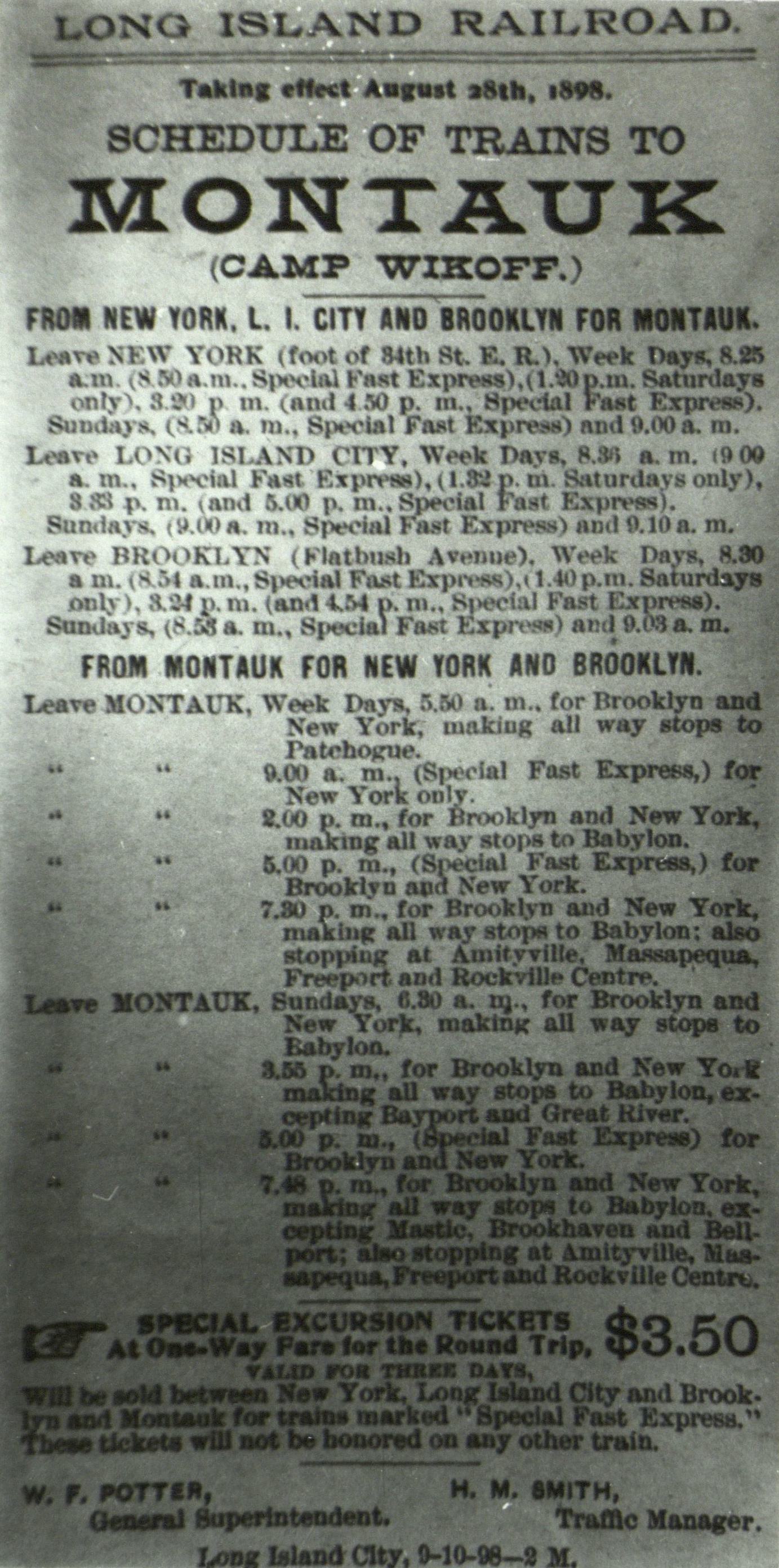 Caption on reverse reads: Long Island train schedule to Montauk, Camp Wikoff, 1898. Copy by C. Frank Dayton.