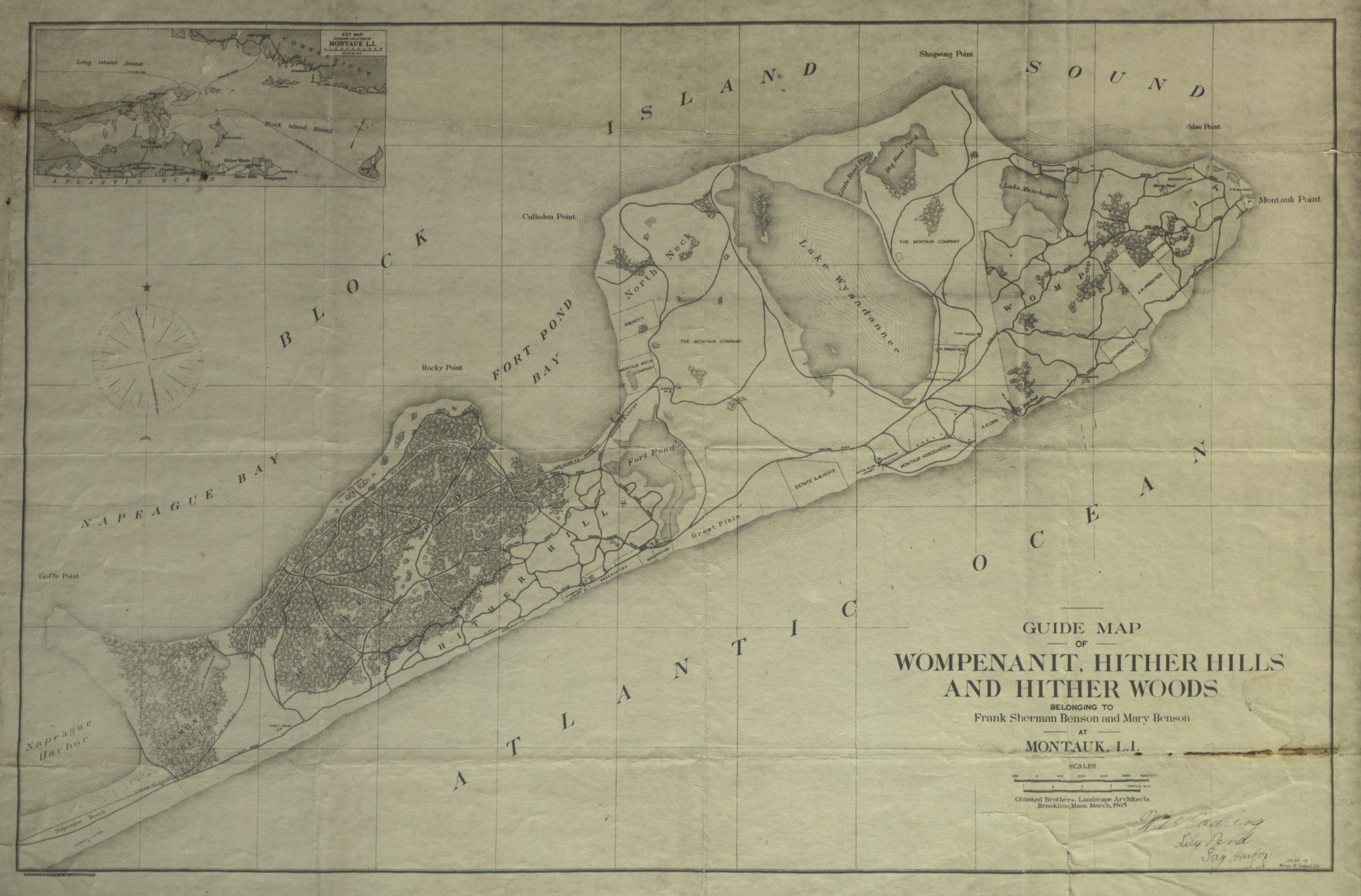 Guide map of Wompenanit, Hither Hills, and Hither Woods, belonging to Frank Sherman Benson and Mary Benson at Montauk, L.I., by Olmsted Brothers, Landscape Architects, March, 1905. Map of area from the eastern shore of Napeague Harbor to Montauk Point [areas owned by the Benson's shaded green on color print copy]; includes Culloden Point, Shagwong Point, False Point, Montauk Point, Lake Wyandannee, Goffe Point, and the lands of A.M. Hoyt, A.E. Orr, J.H. Prentice, E.O. Steel, the Montauk Company, and the Montauk Association. Features delineated included existing adjoining landowners and structures, the tracks of the Long Island Rail Road Montauk Extension, existing structures and roads, and numerous localized place names. Name "William B. Codling, Lily Pond [East Hampton Village, N.Y.], Sag Harbor" handwritten on bottom right corner [real estate professional], [map no.] 2636-13 William M. Humans Del. [likely the draftsman].