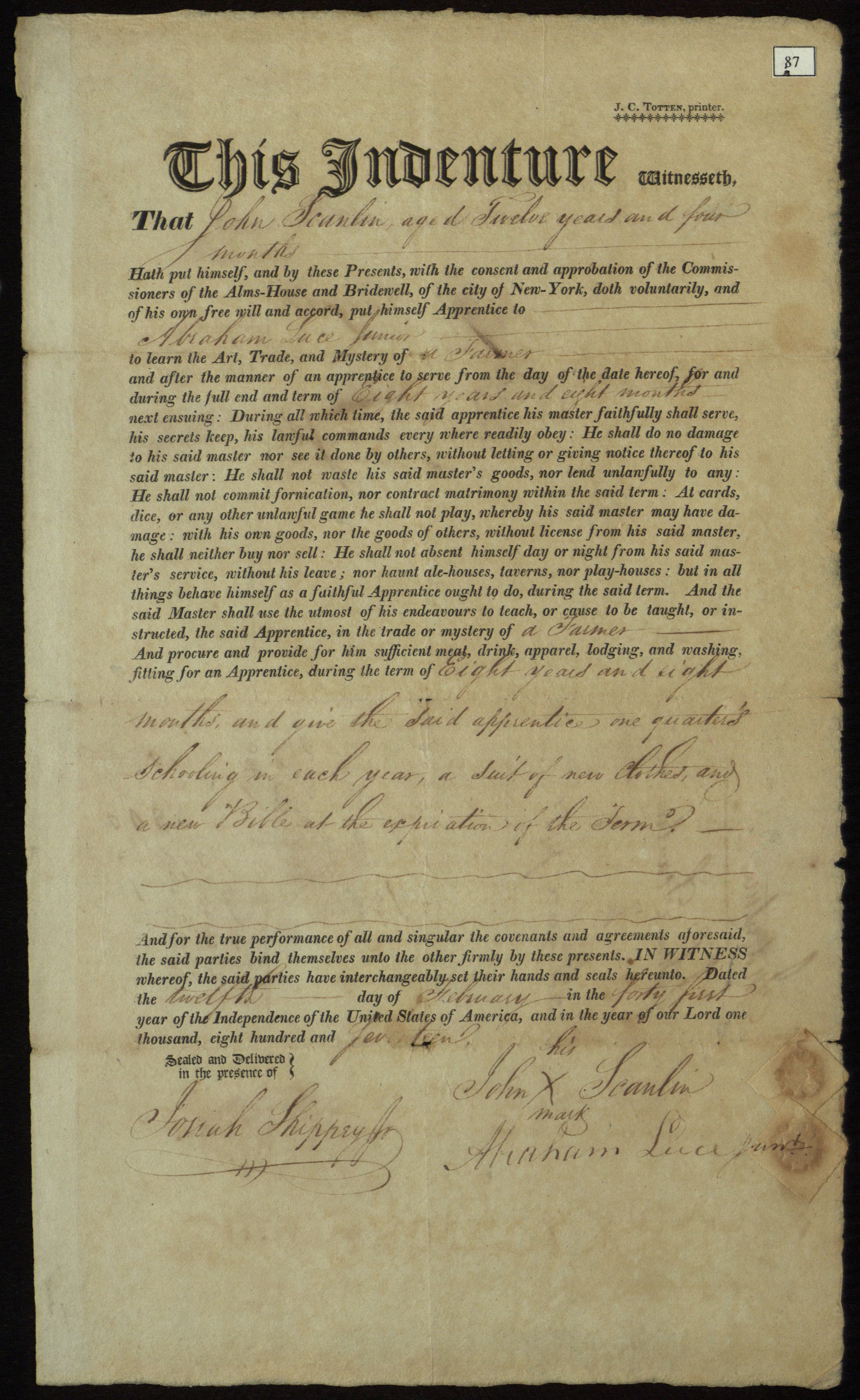 John Scanlin's apprentices indenture, to Abraham Luce, Riverhead, N.Y., 1817.