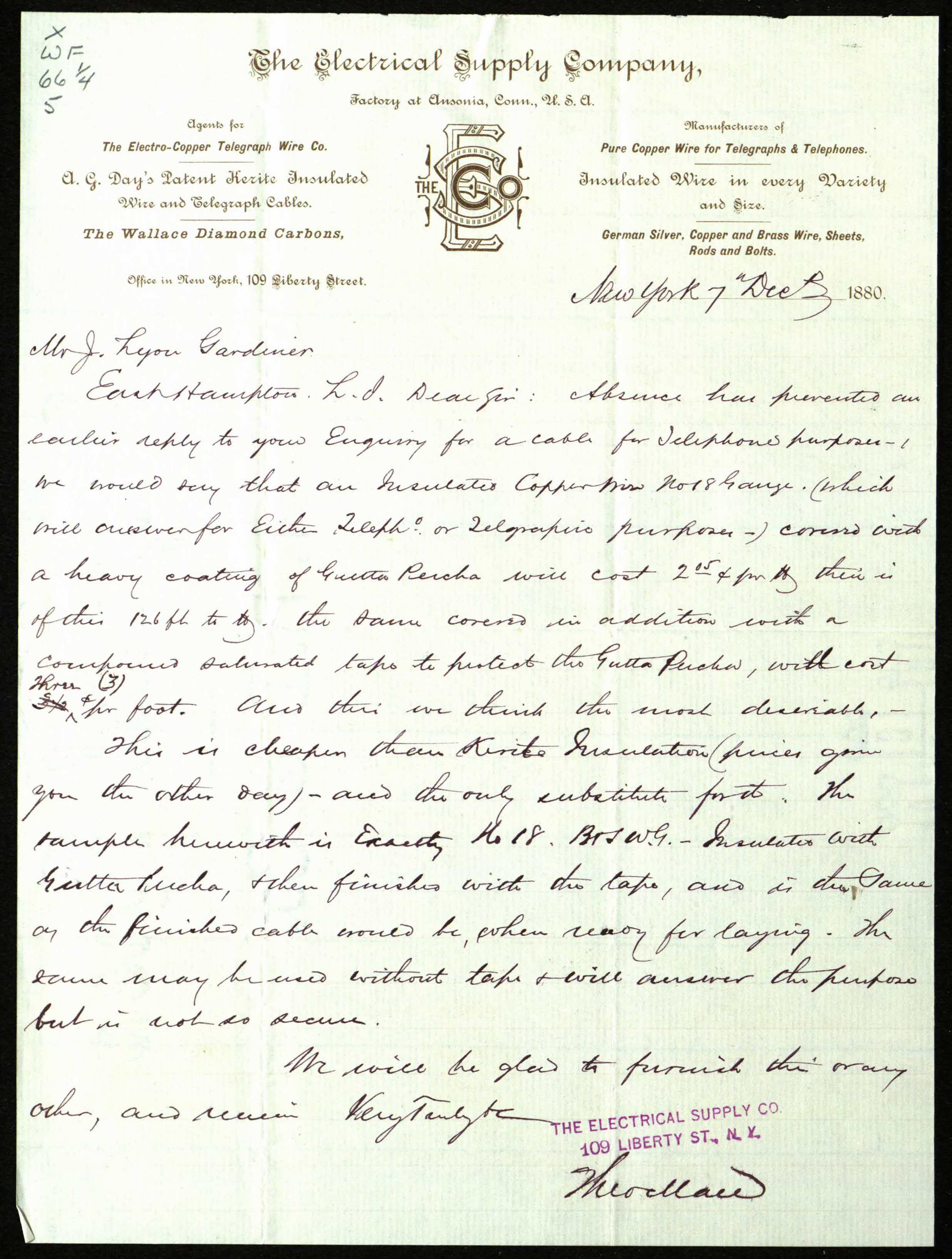 Letter to John Lyon Gardiner from The Electrical Supply company, regarding telephone cable costs, December 7, 1880.