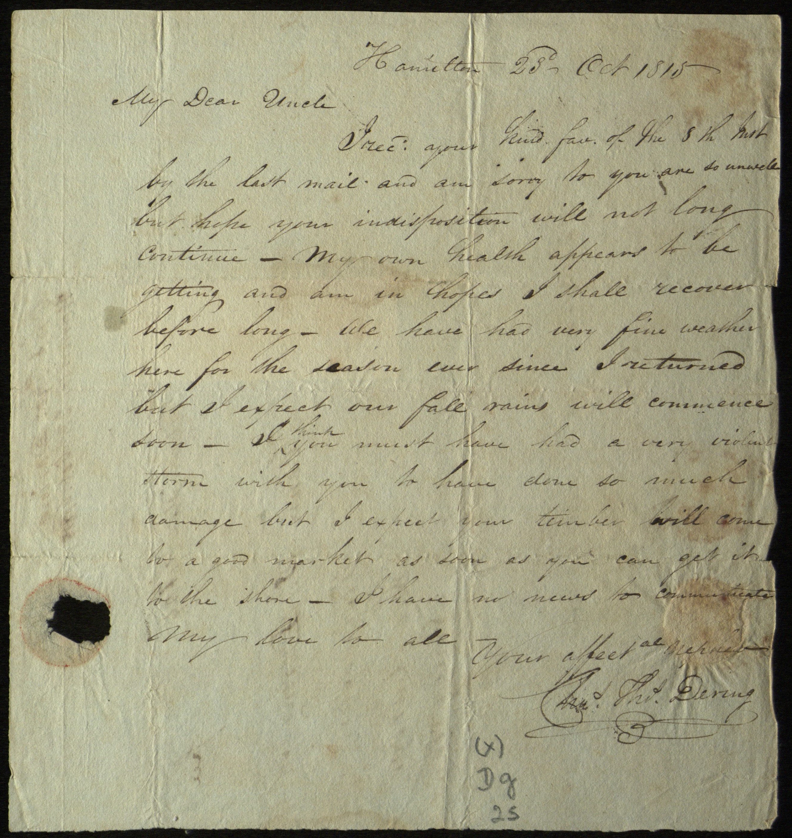 Letter to Henry P. , Sag Harbor, N.Y., from his nephew, Charles Thomas , October 23, 1815.