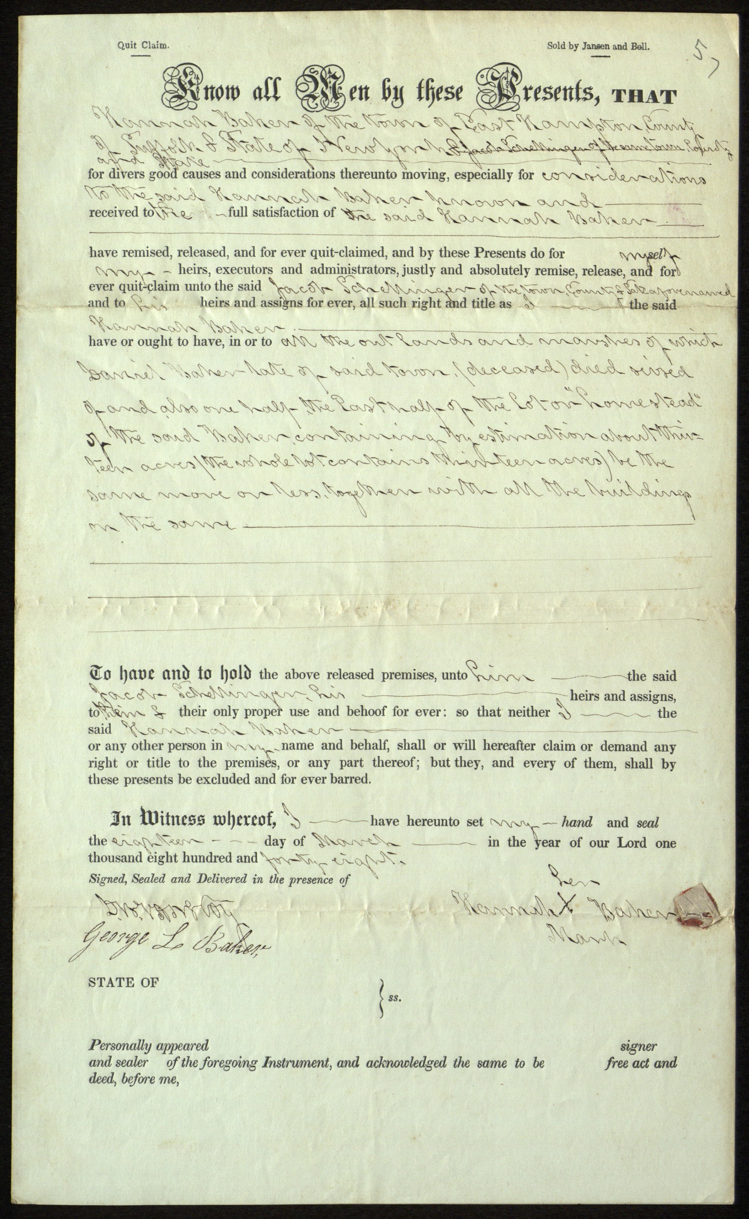 Deed for 13 acres of land and homestead, located in Amagansett, N.Y., March 18, 1848.