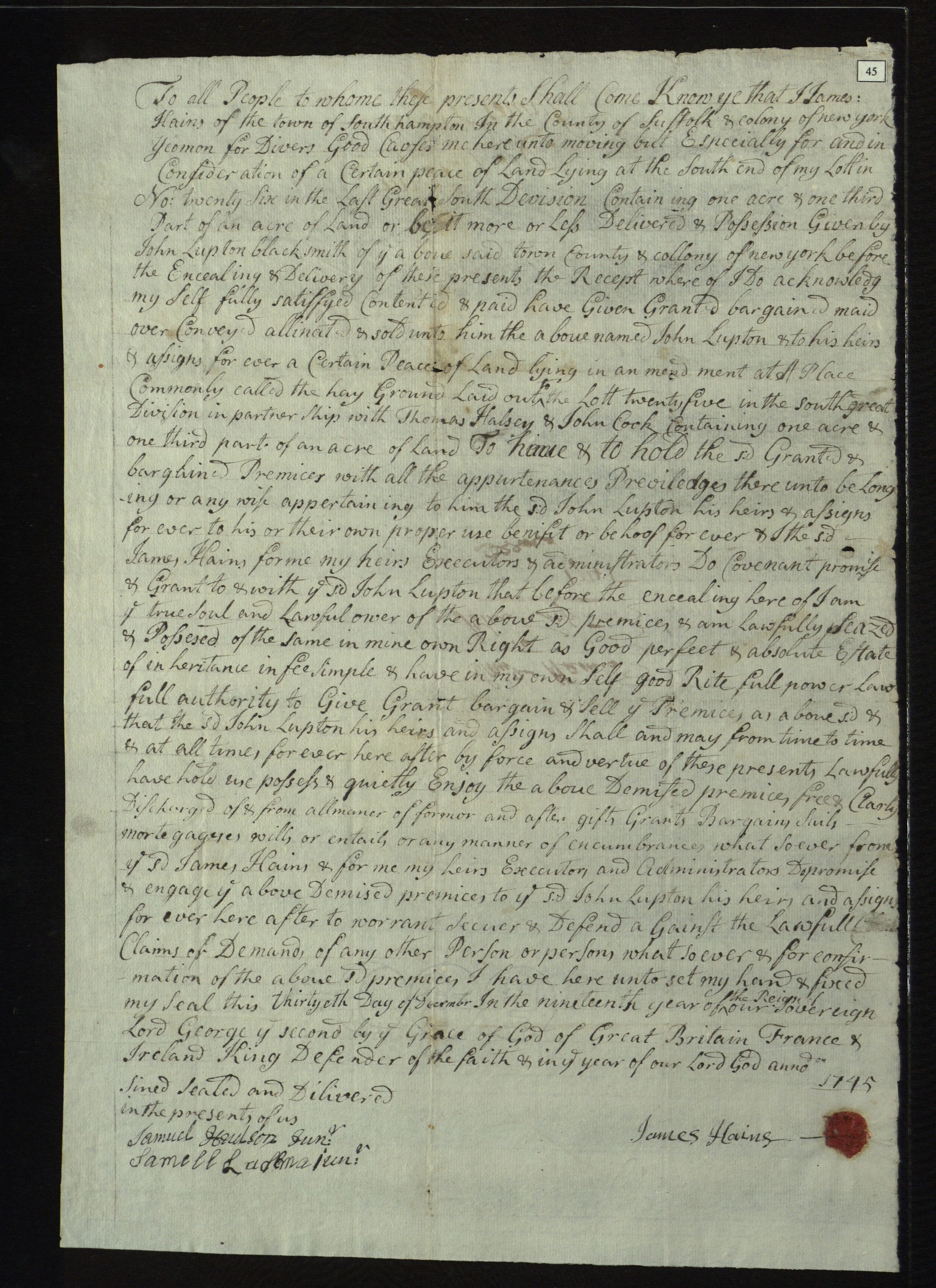 Exchange of land in Southampton Township, N.Y., between James Hains, yeoman, and John Lupton [Jr.], blacksmith; 1 1/3 acre in an amendment of land laid out to lot # 25, in the Great South Division, at Hayground, for 1 1/3 acre at south end of lot # 26 in same division; December 30, 1745. Witnessed by Samuel Hudson Jr. and Samuel Ludlma [Ludlam ?] Jr.