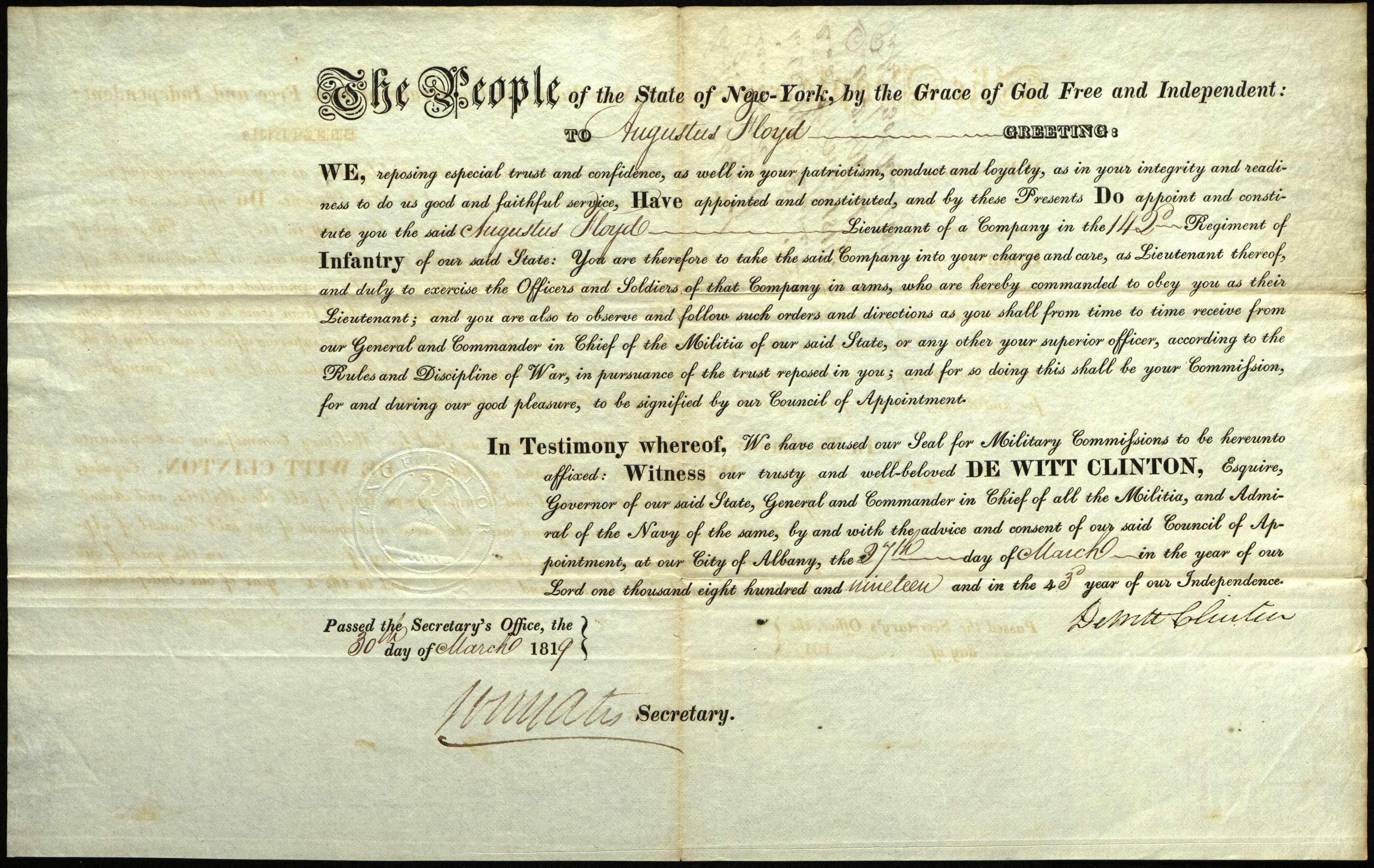 Commission of Lieutenant in the 142nd Regiment of Infantry, New York, for Augustus Floyd, March 27, 1819. [Augustus Floyd was born in Mastic, N.Y., 1795.]