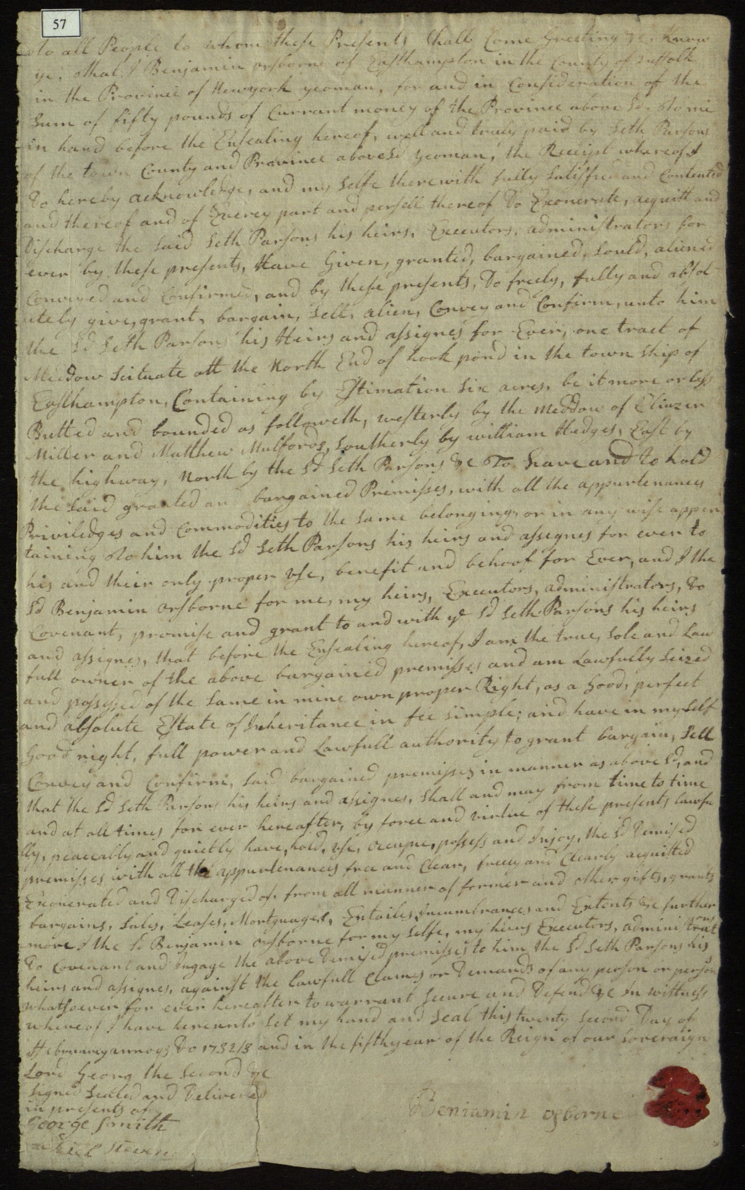 Benjamin Osborn's deed to Seth Parsons, East Hampton, N.Y., 1732