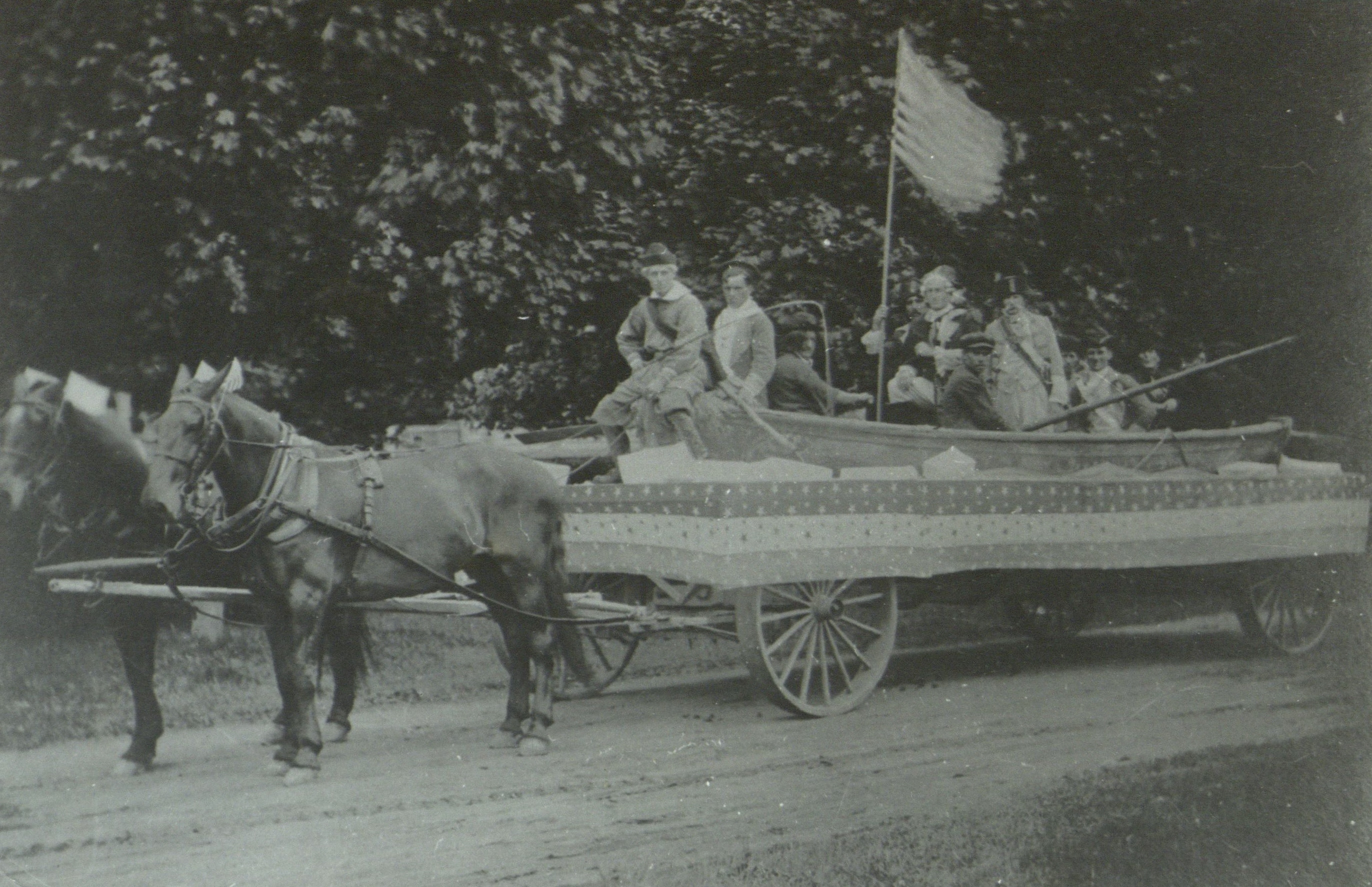 Caption on reverse reads: This photo was taken at the Fourth of July parade of 1916. It depicts Washington crossing the Delaware through cakes of ice. The driver is Herbert Hedges, holding the flag, Daniel Tucker, as George Washington, and standing beside him, Felix Dominy. Copy by C. Frank Dayton.