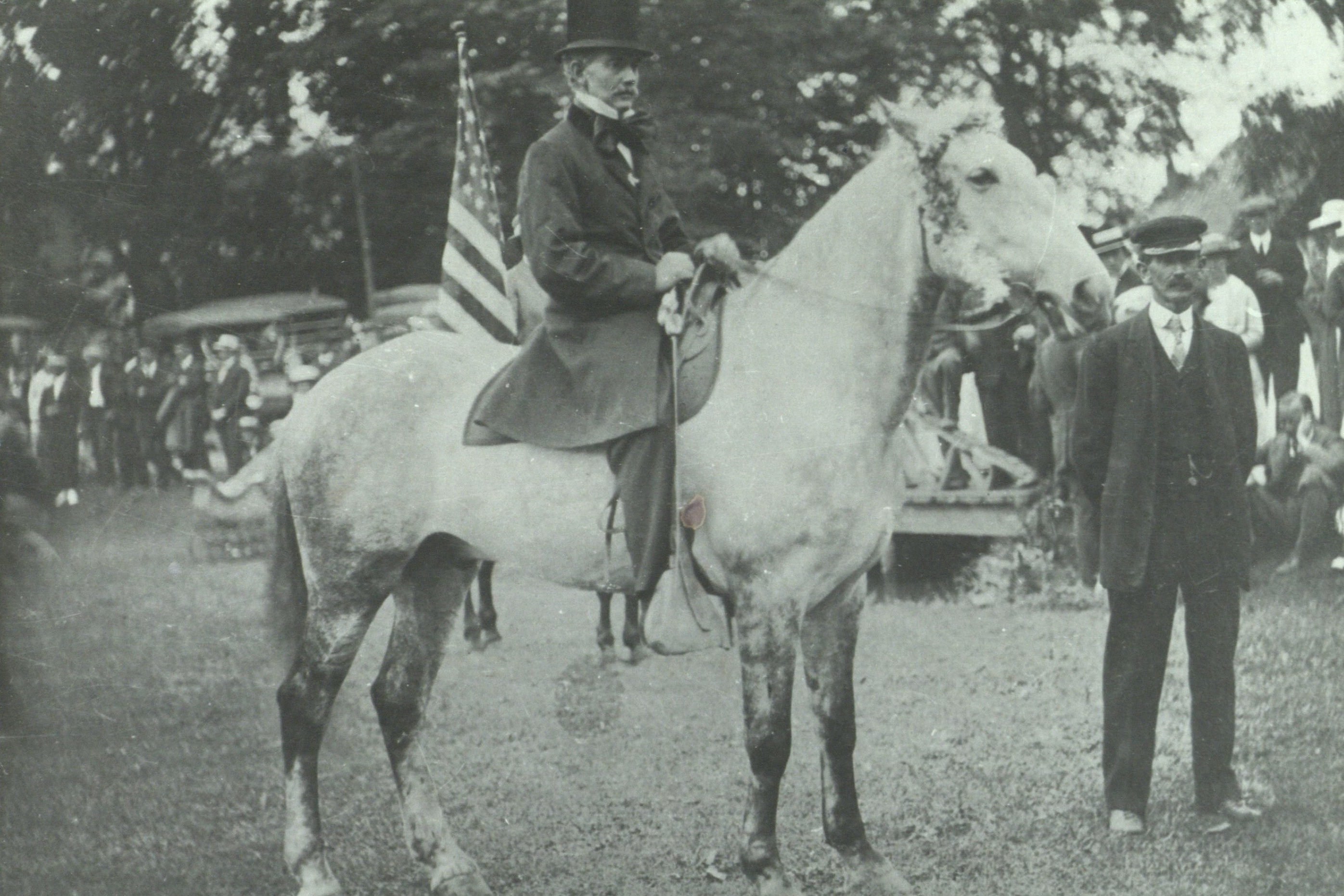 Caption on reverse reads: Charles O. Gould, mounted on a horse, ridden in the Fourth of July parade of 1915. Standing at his right is his brother, J. Arter Gould. Copy by C. Frank Dayton.