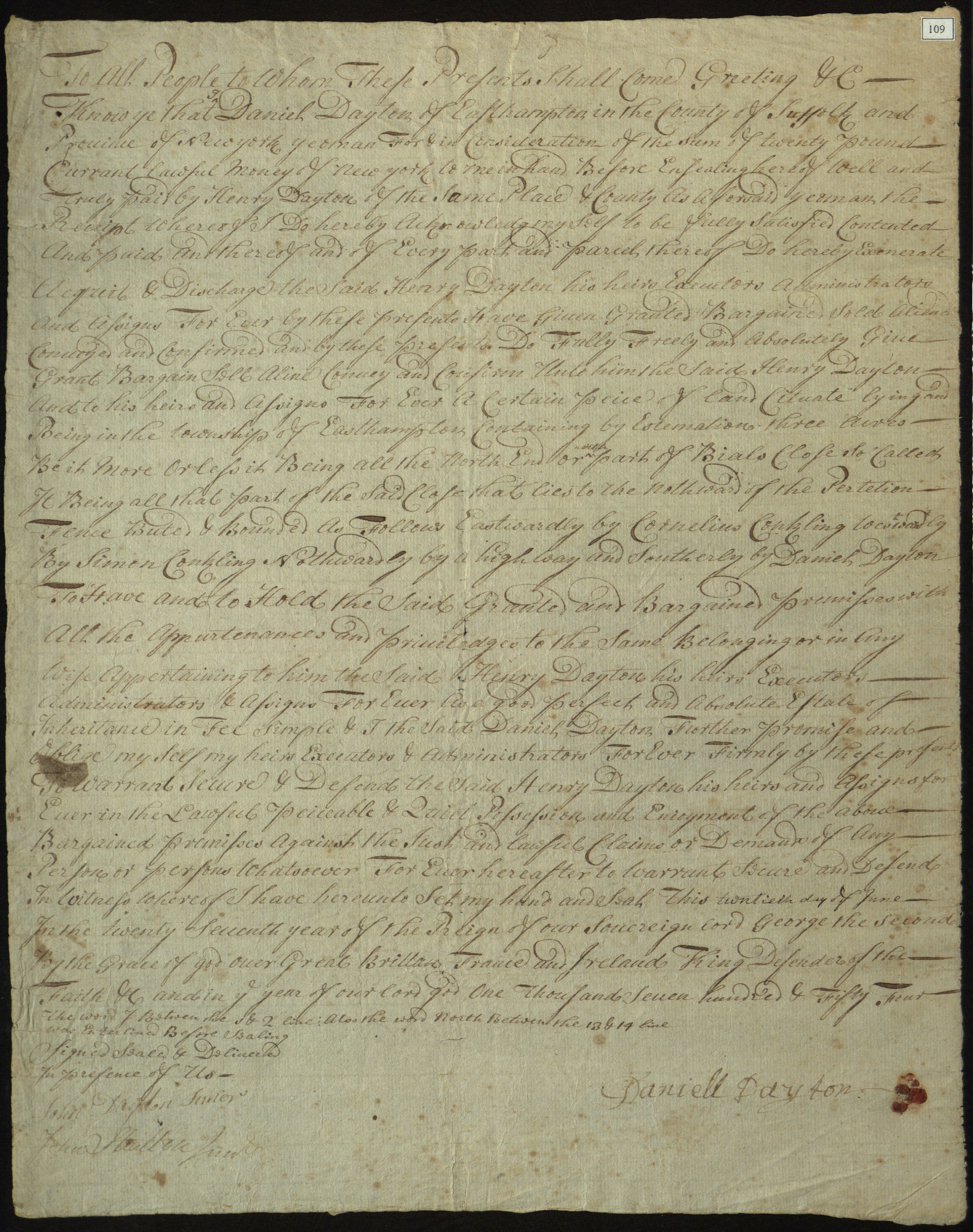 Sale of parcel in Bial's Close, in East Hampton Township, N.Y., by Daniel Dayton, yeoman, to Henry Dayton, yeoman; April 25, 1755. 3 acre parcel in the northern portion of close (enclosure), bounded on the east by Cornelius Conkling; witnessed by John Dayton Jr. and John Stratton Jr.