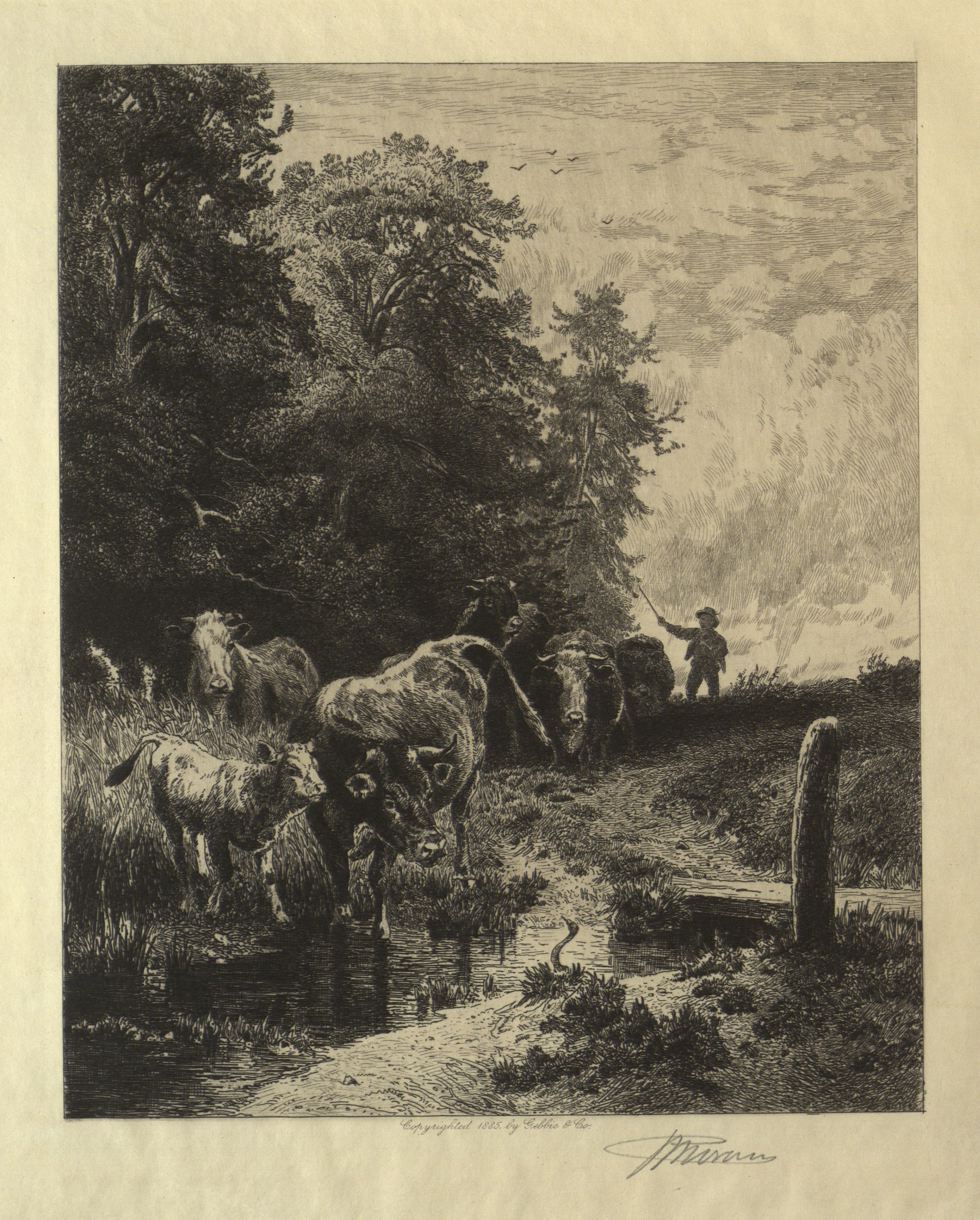Original etching of cattle standing at the edge of a pool of water in foreground, a young herder in background, by Peter Moran.