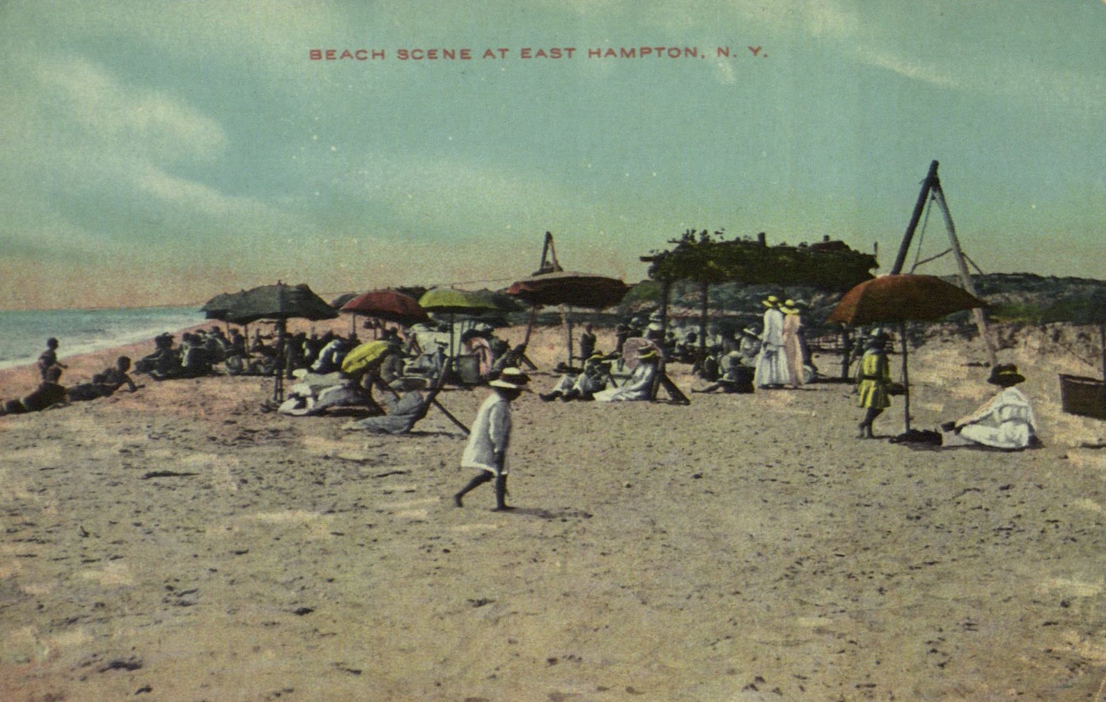 Postcard image depicts a beach scene, at East Hampton, L.I.