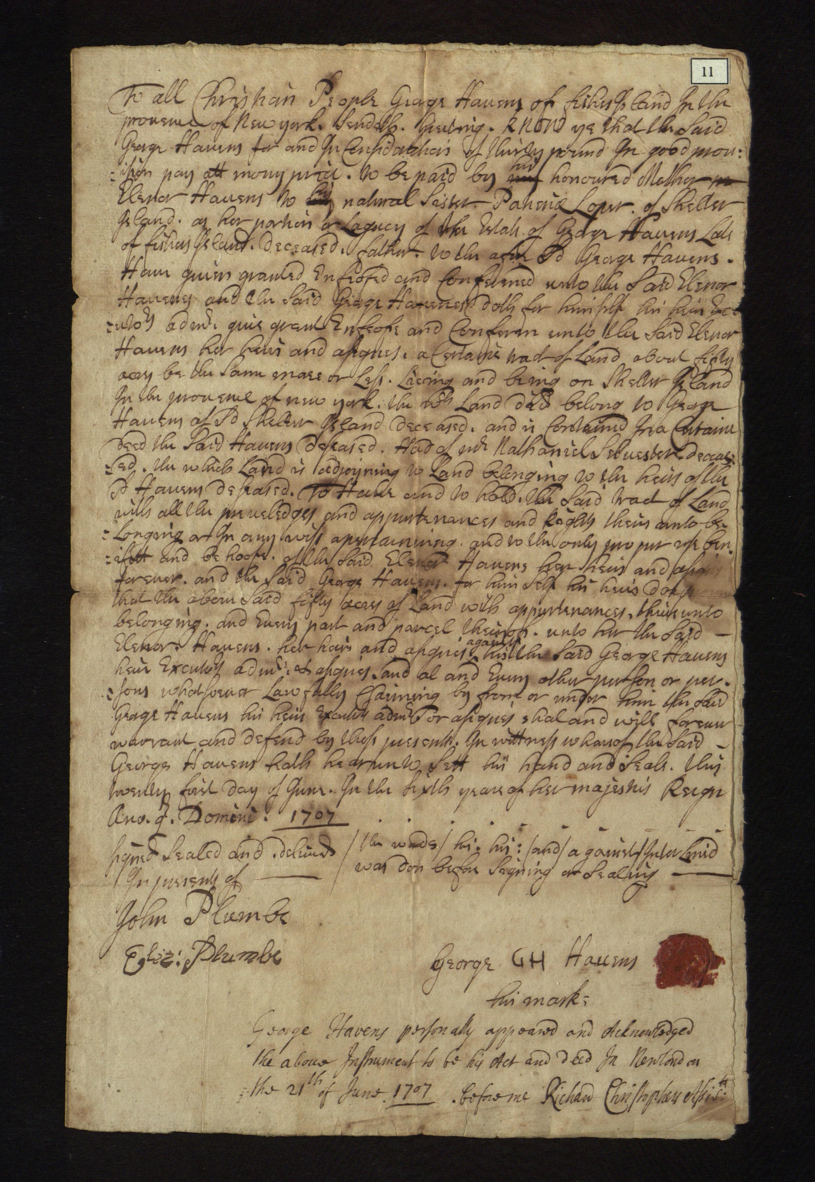 George Havens' deed to Eleanor Havens, 1707.