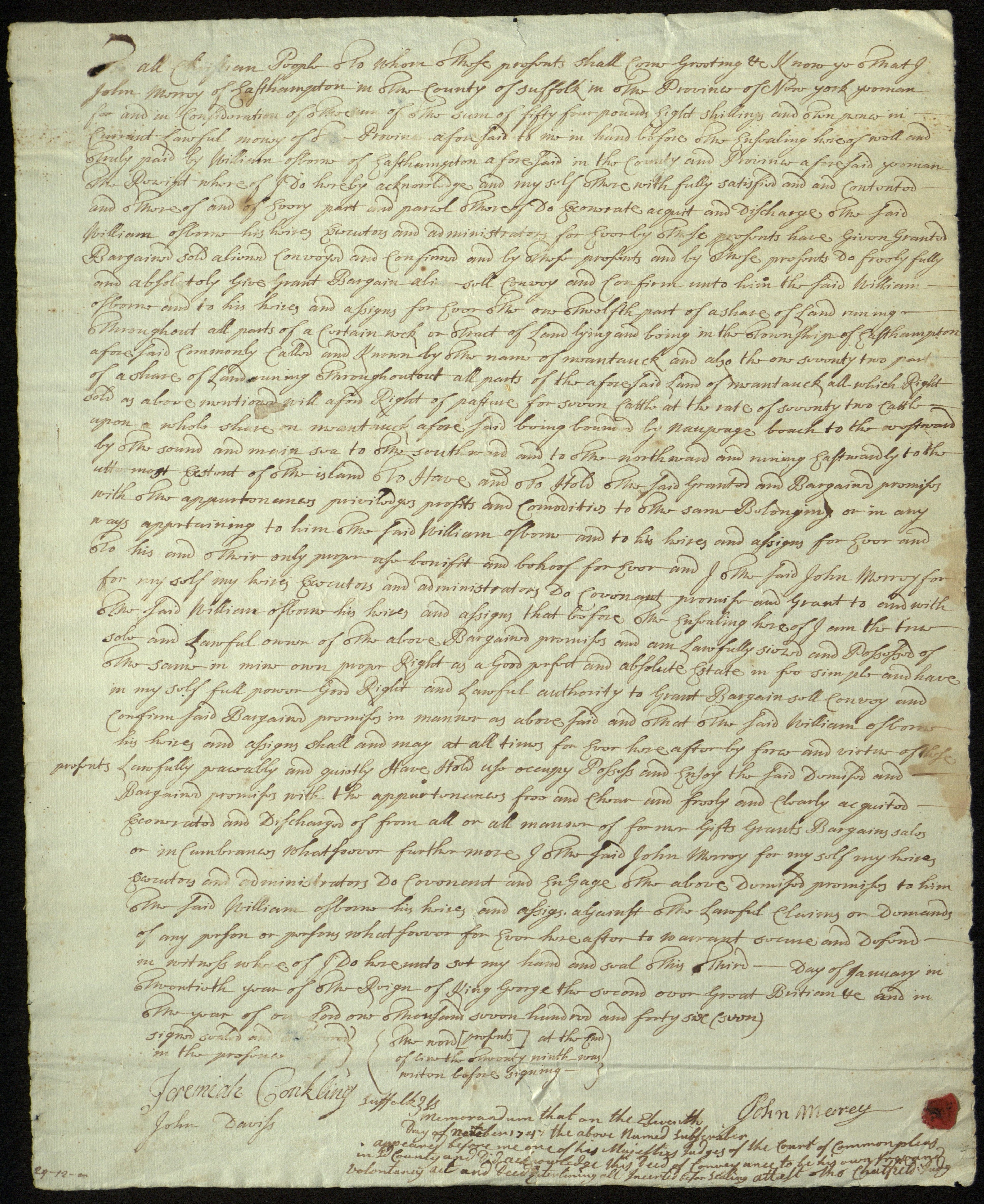 Deed for land in Montauk, township of East Hampton, N.Y., 1746/1747