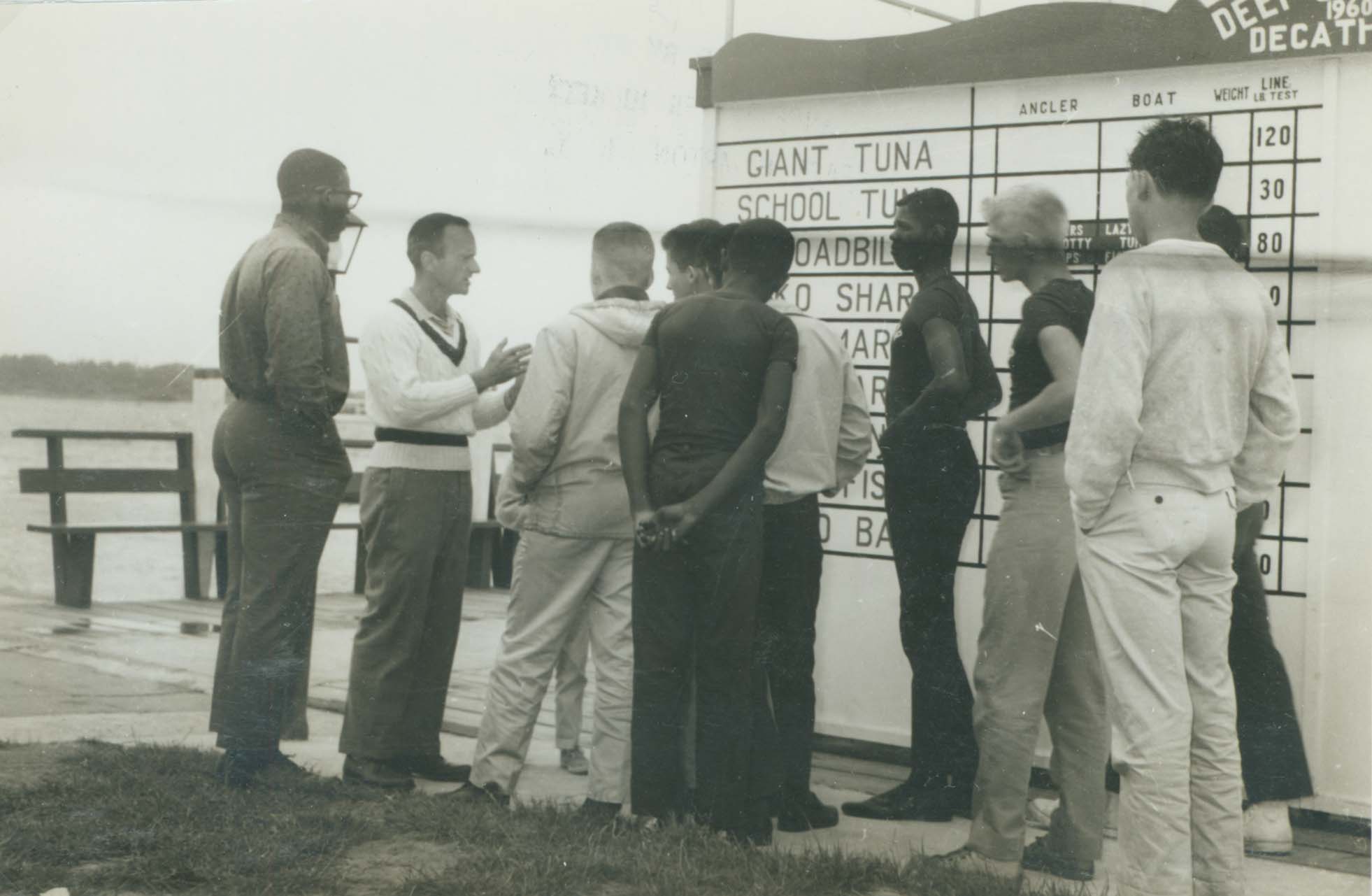 Anthony Drexel Duke (Founder of Boys Harbor - currently known as Boys & Girls Harbor) discussing deep sea fishing with his campers at Deep Sea Club in East Hampton, New York.