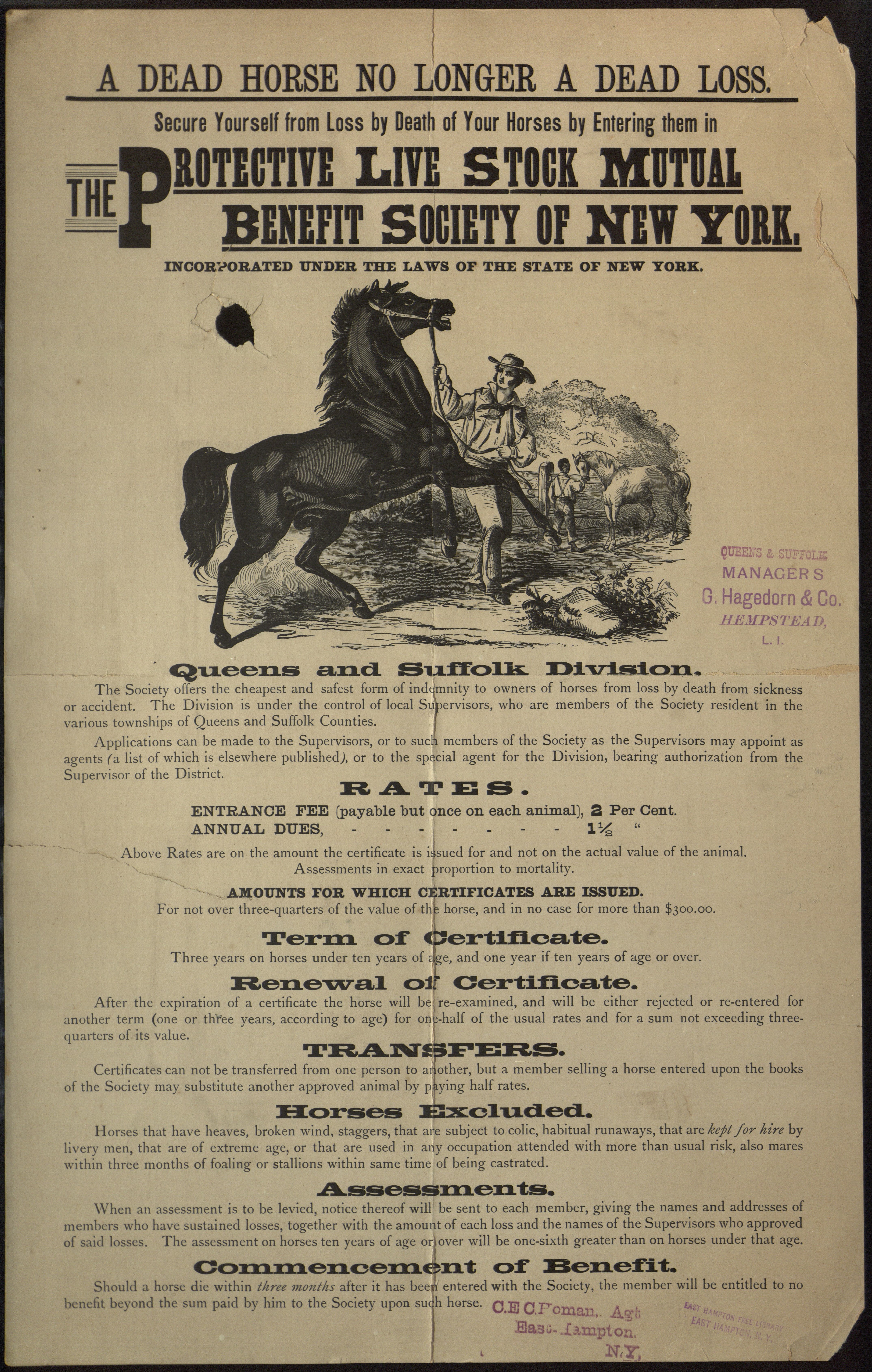 Advertisement giving rates, transfers, assessments, etc. of the Queens and Suffolk County divisions. Caption reads, "A dead horse, no longer a dead loss".