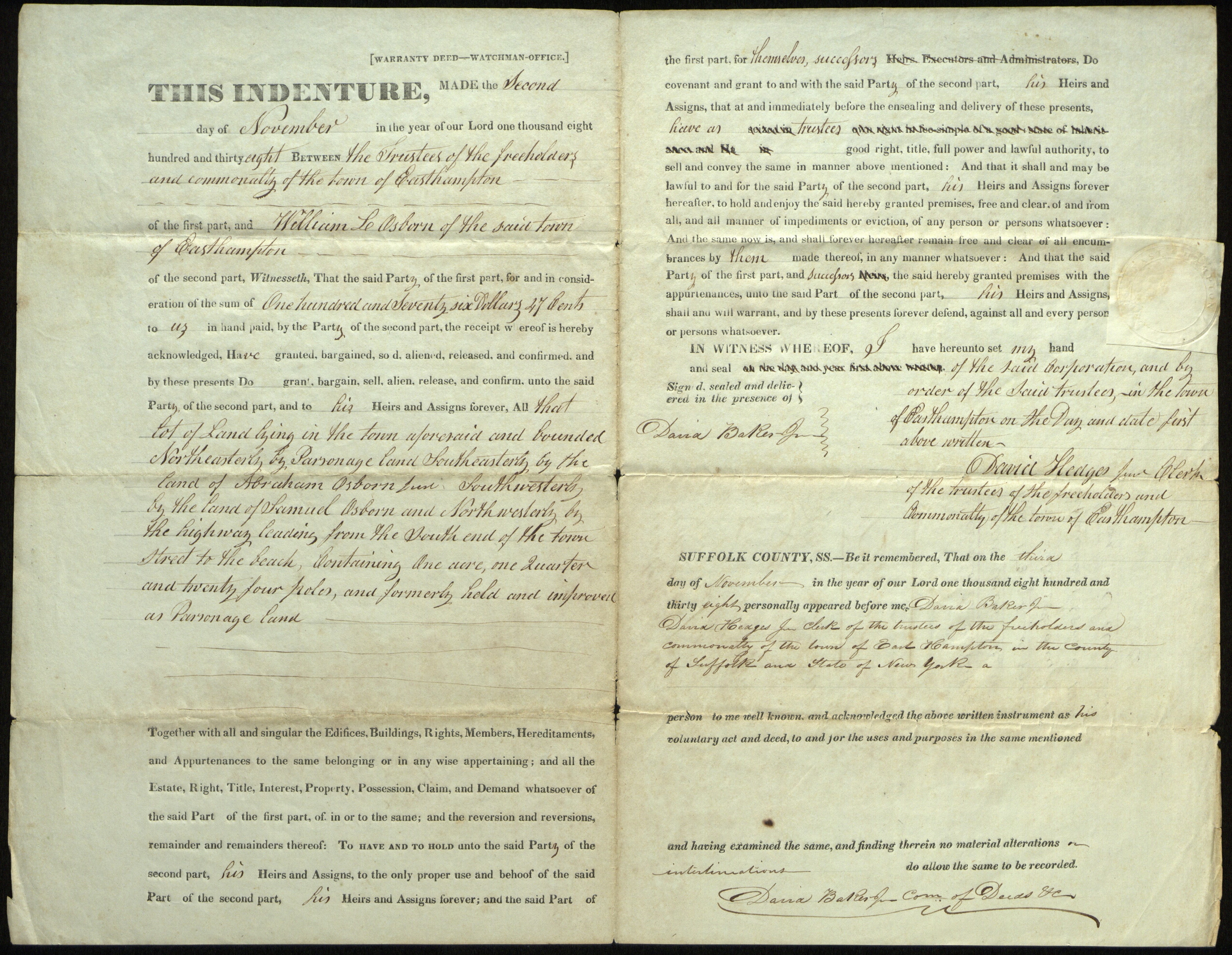 Deed to William L. Osborn, "lot of land containing one acre ... and formerly held ... as Parsonage land." November 2, 1838.