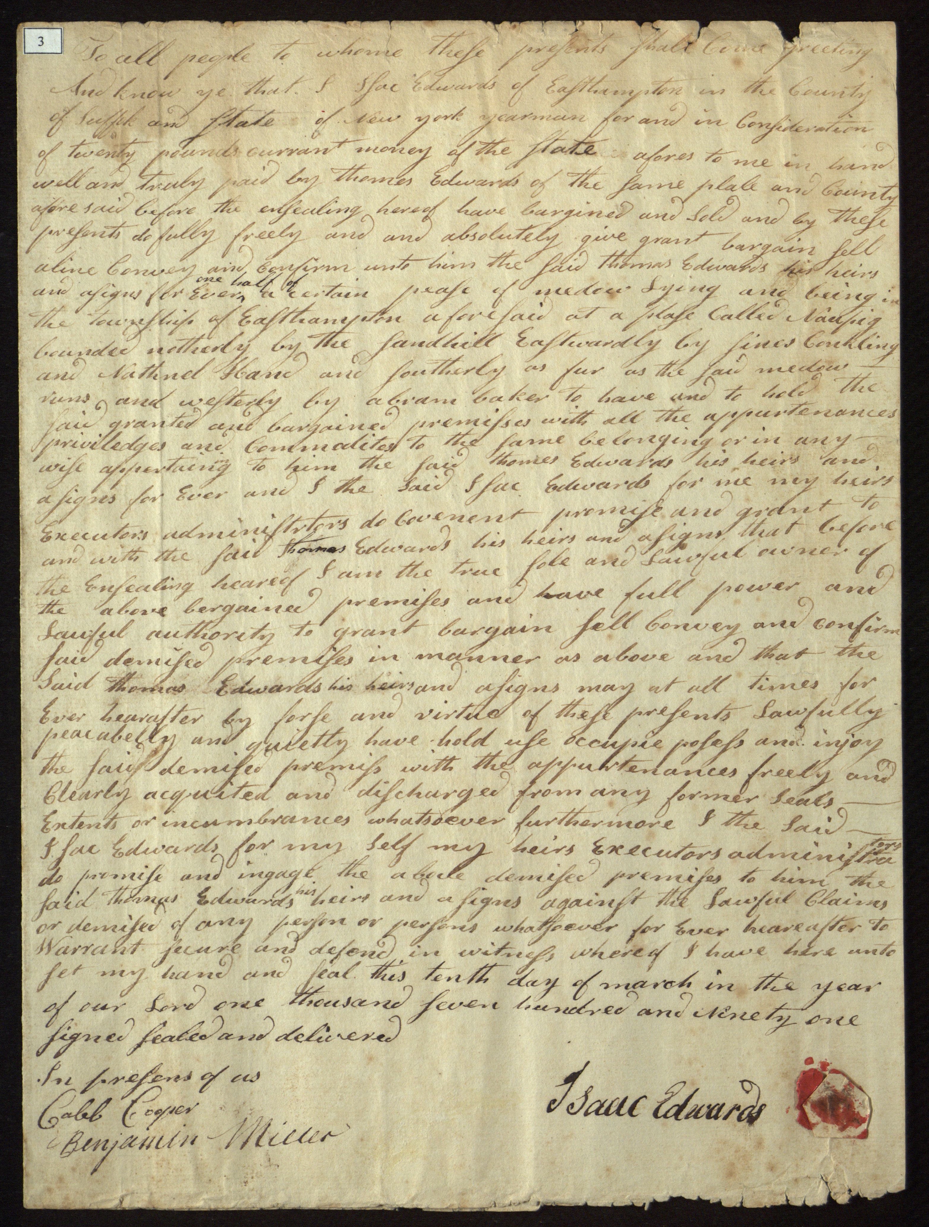Sale of half of a parcel of meadow at Napeague, in East Hampton Township, N.Y., by Isaac Edwards, yeoman, to Thomas Edwards, March 10, 1791. Half of parcel of meadow [acreage not stated] for 20; bounded on the north by the sand hill, on the east by [illegible] Conkling and Nathaniel Hand, on the south "as far as the said meadow runs," and on the west by Abraham Baker; witnessed by Caleb Cooper and Benjamin Miller.