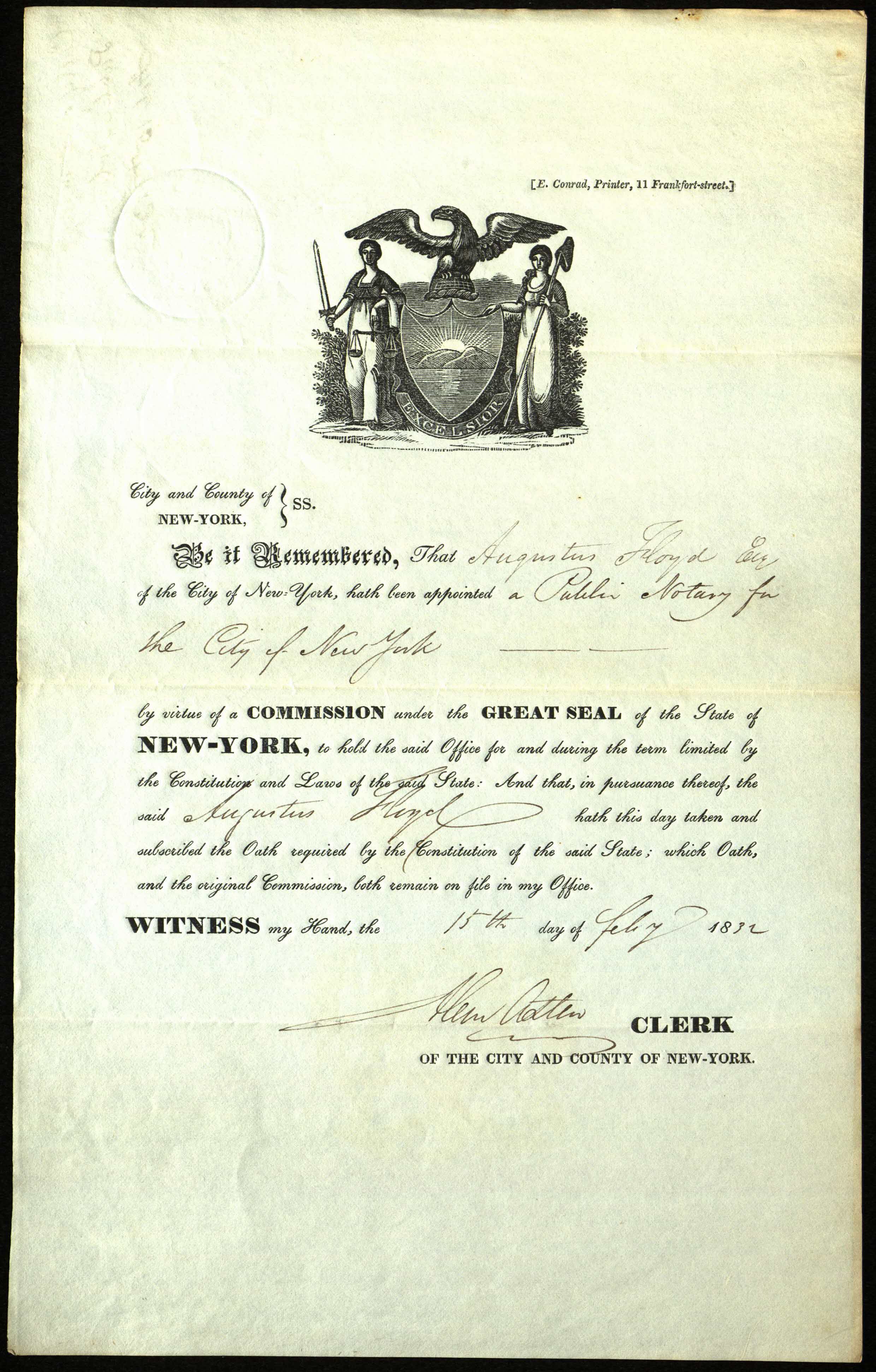 Appointment as Public Notary of the City of New York, for Augustus Floyd, February 15, 1832. [Augustus Floyd was born in Mastic, N.Y., 1795.]