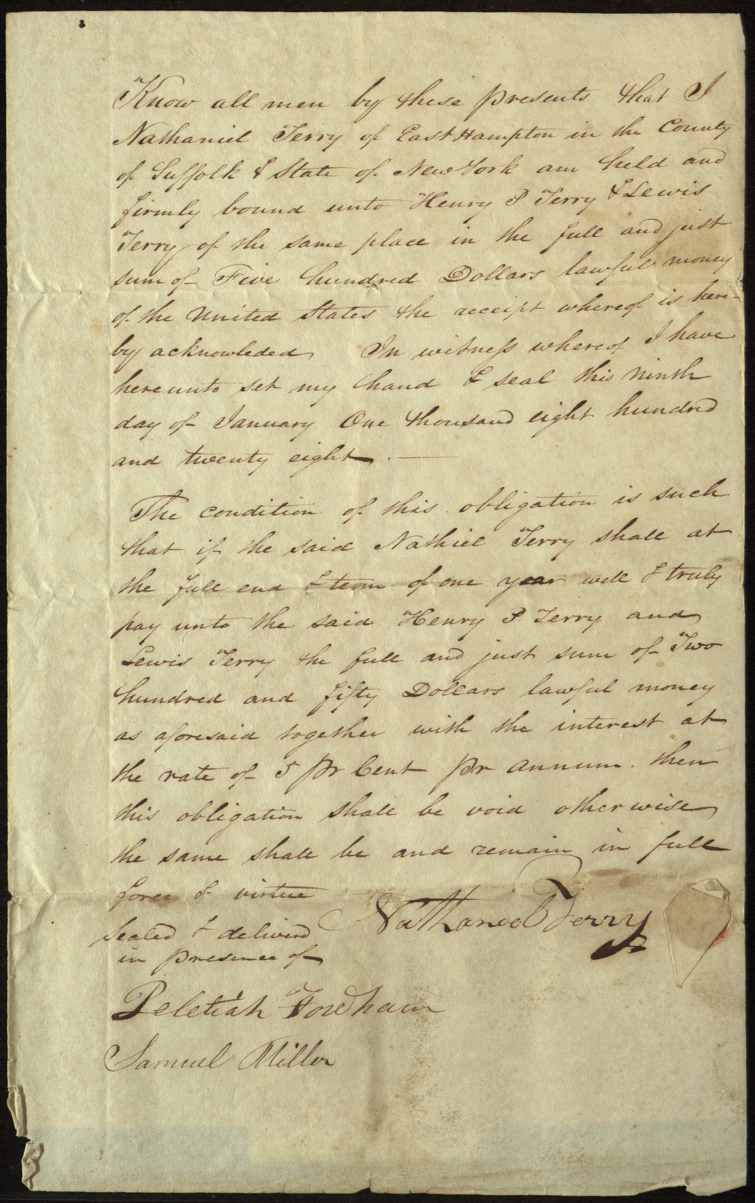 Bond for 500 dollars to be paid to Henry P. Terry and Lewis Terry. Jan. 9, 1828.