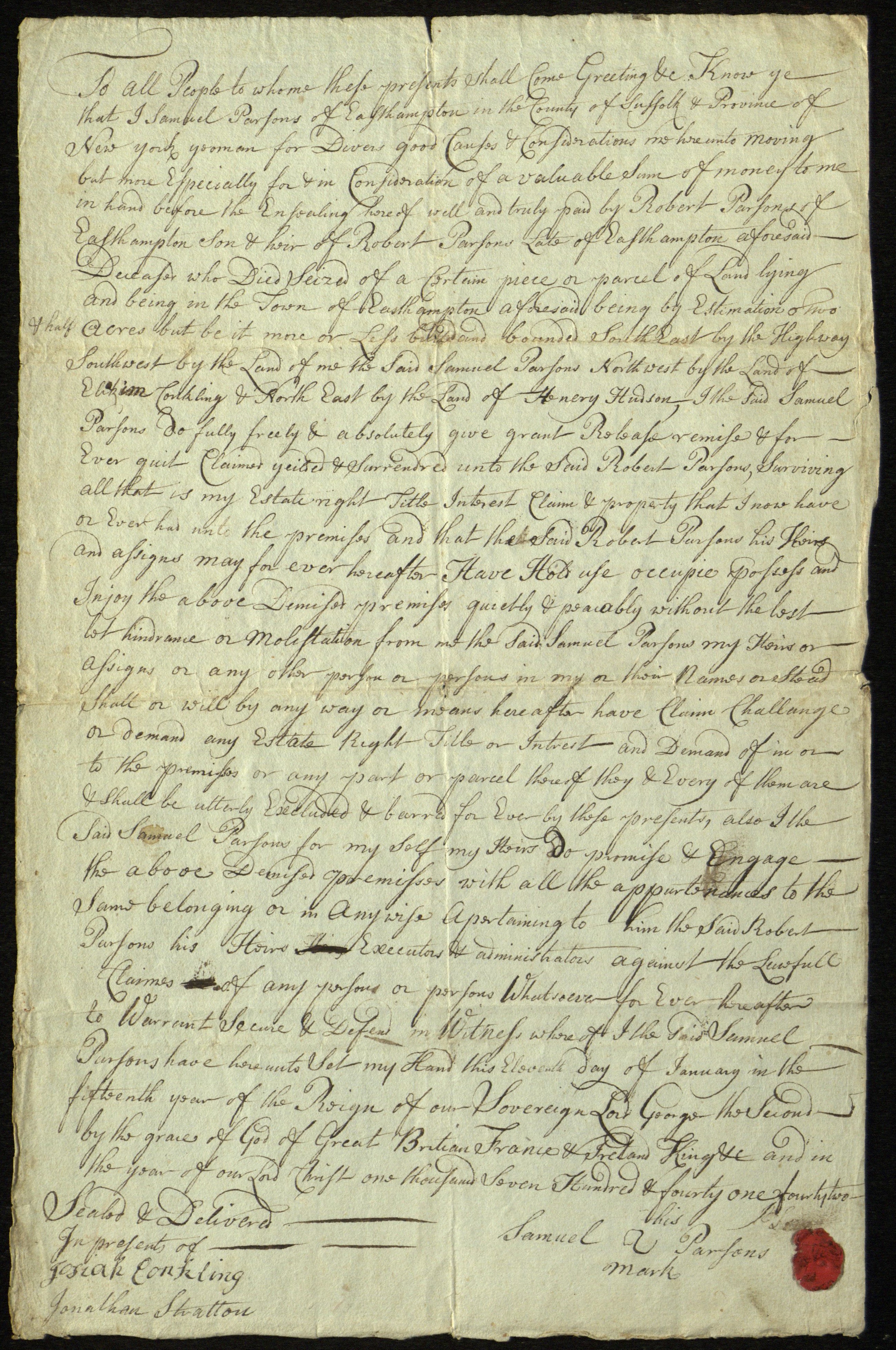 Deed for 2-1/2 acres of land in East Hampton, N.Y., January 11, 1741.