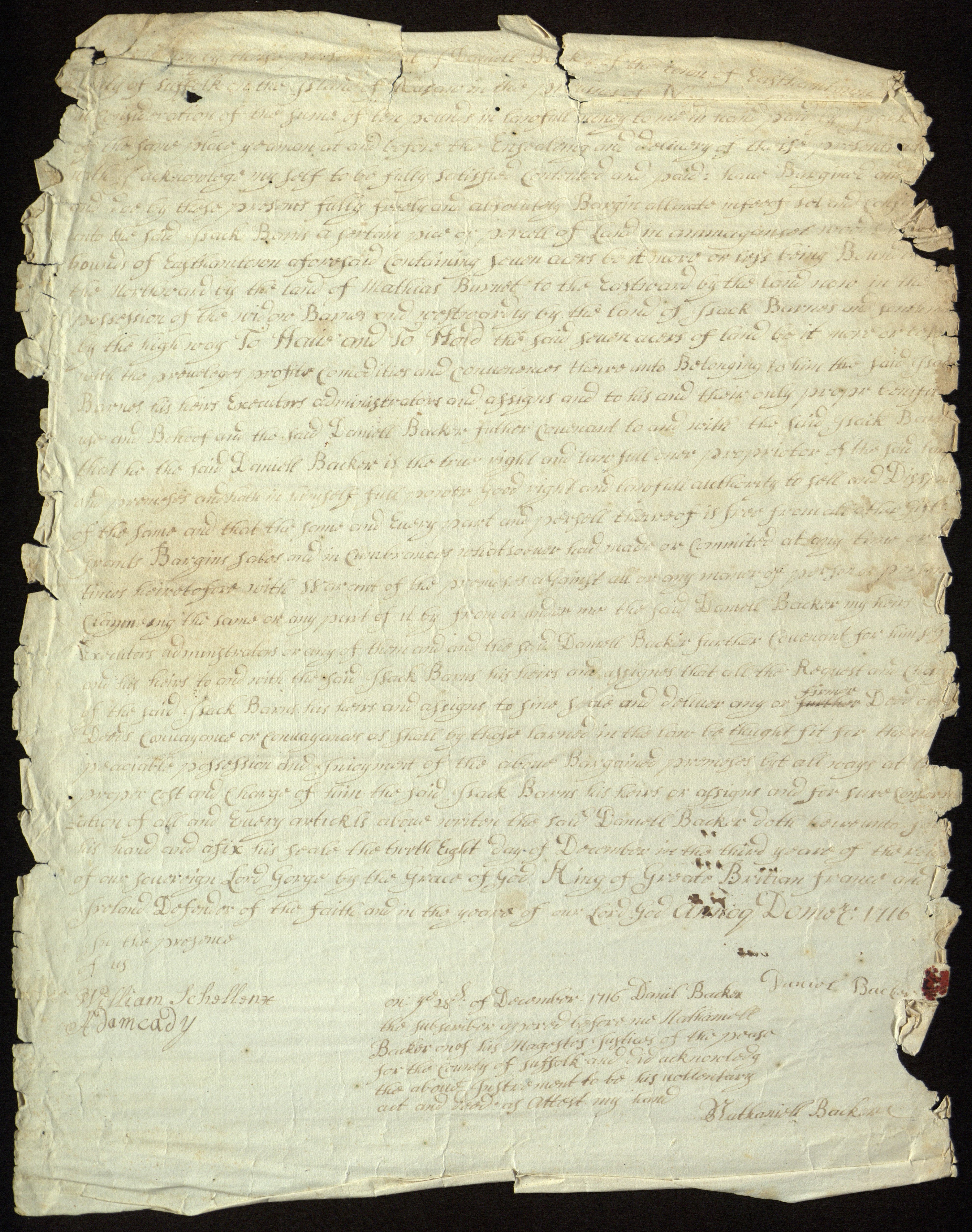 Deed for 7 acres of land, located in Amagansett, N.Y., December 8 (?), 1716.
