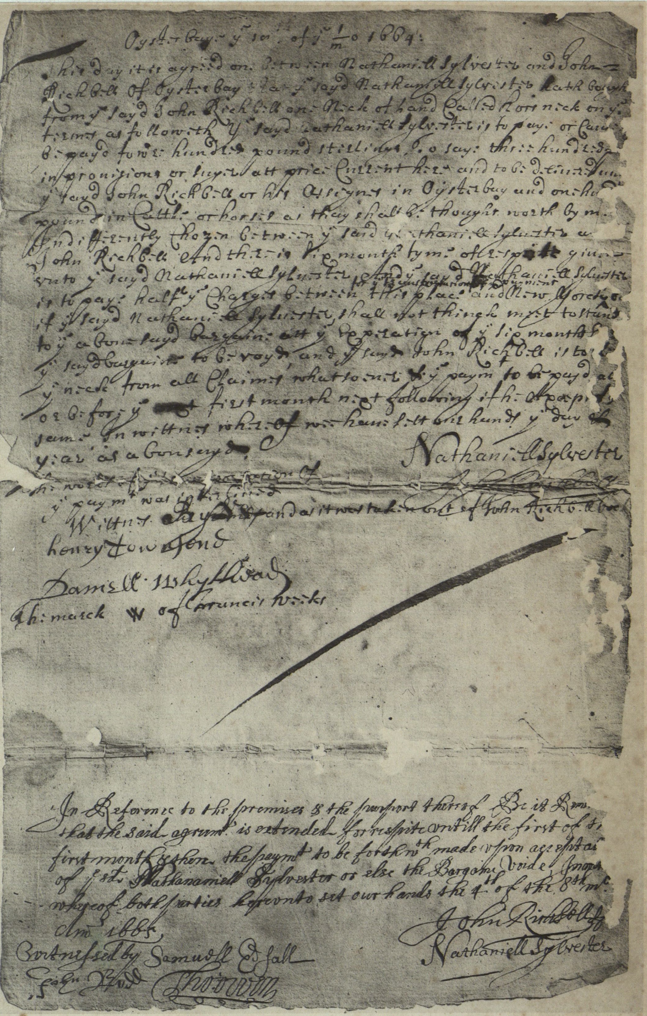 Photocopy: Nathaniel Sylvester's land agreement with John Nicholls of Oyster Bay, 1664, Samuel Edsall, witness.