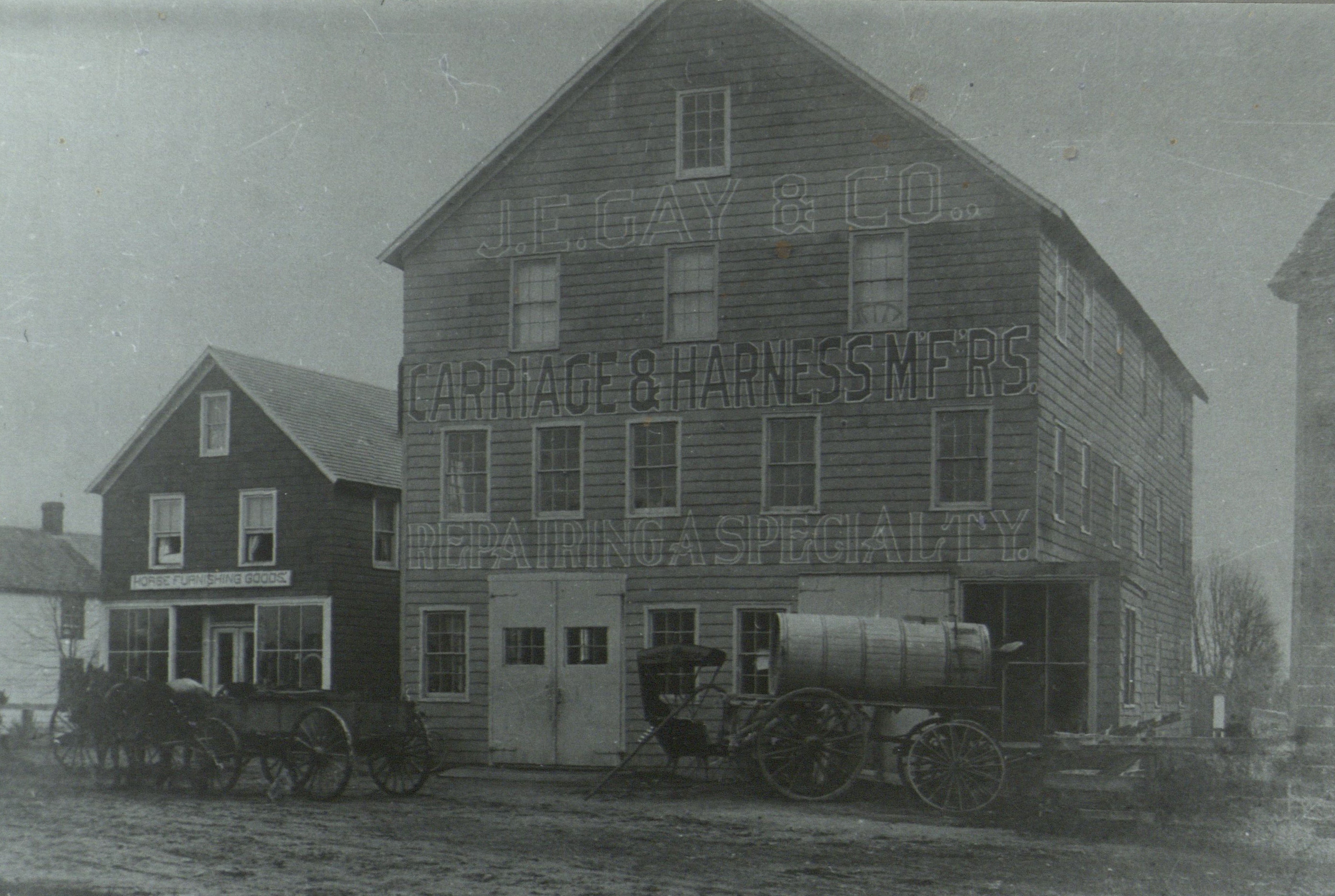 Caption on reverse reads: The James E. Gay carriage and blacksmith shop stood on Gay Road at the same site as the Amaden-Gay Agency. The doors at the front opened into the wheelwright shop, where carriage wheels, spokes, shafts, etc. were made. At the right was the harness making room. At the rear of the building, a large area equipped with two forges, was used exclusively for horse shoeing. In an adjoining area, also equipped with a forge and various iron shaping tools, the iron work for the carriages was made. At the center of the building a large elevator was used to lift vehicles to the second and third floors, which were used for painting, decorating, and storage. The building was completely destroyed by fire in the late 1930's. Copy by C. Frank Dayton.