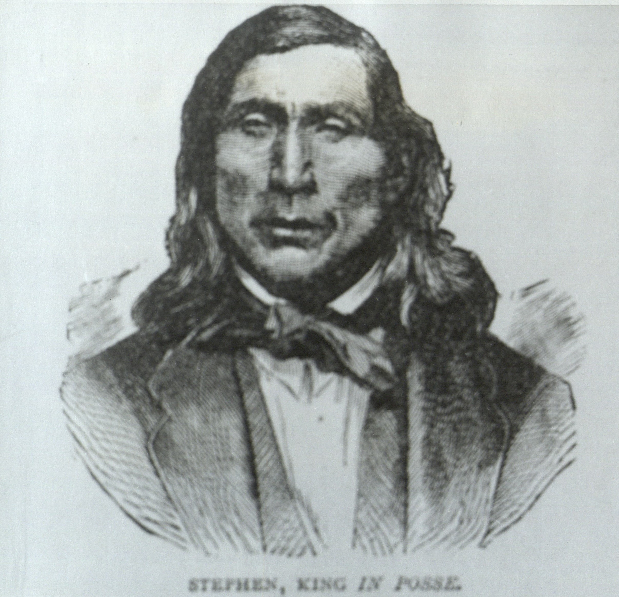Photograph of an etching. Caption on back of photograph reads: "Stephen Pharoah was the most popular Montauk Indian since Sachem Wyandanch's time back in 1656. Known to residents of East Hampton and vicinity as Steve Talkhouse, he is still a topic of conversation so much so, that one would expect to see Steve coming thru the door at any moment. The name of Talkhouse is still a mystery but recently, John Waters, a 99 year old Matinecock Indian of Little Neck, Long Island says that the name Talkhouse derives from the fact that at Indian meetings Steve was always the most eloquent speaker in the house. Mr. Waters also says that Steve's wife was called Hannah Chiphouse because she always kept the chips burning in the pot bellied stove at the Indian meeteings. Steve was a famous walker and the New Haven register, Tuesday Nov. 7, 1961, in its "Believe it or Not" column says, "Stephen Pharoah, son of a king of the Montauk Indians, walked from Brooklyn to Montauk, a distance of 140 miles in a single day!" This story has always been doubted by East Hampton residents but Ripley has a standing cash offer to any who can disprove his statements and since no one has offered proof to the contrary, the statement can be accepted. In the fenced in area at Indian Field, Montauk, Steve's grave may be distinguished by a lone American flag since he was a veteran of the Civil War. He was born in a wigwam on a little plot of land in what is now the village of Springs, Long Island. the plot is known as Molly's Hill. He joined the gold rush to California and Wisconsin Montauks claim that he stopped off in Brothertown to visit relatives on his way back. He was also hired by P.T. Barnum as the World's Champion Walker. He died in 1879, the same year the Montauks lost their reservation through fraud and trickery."