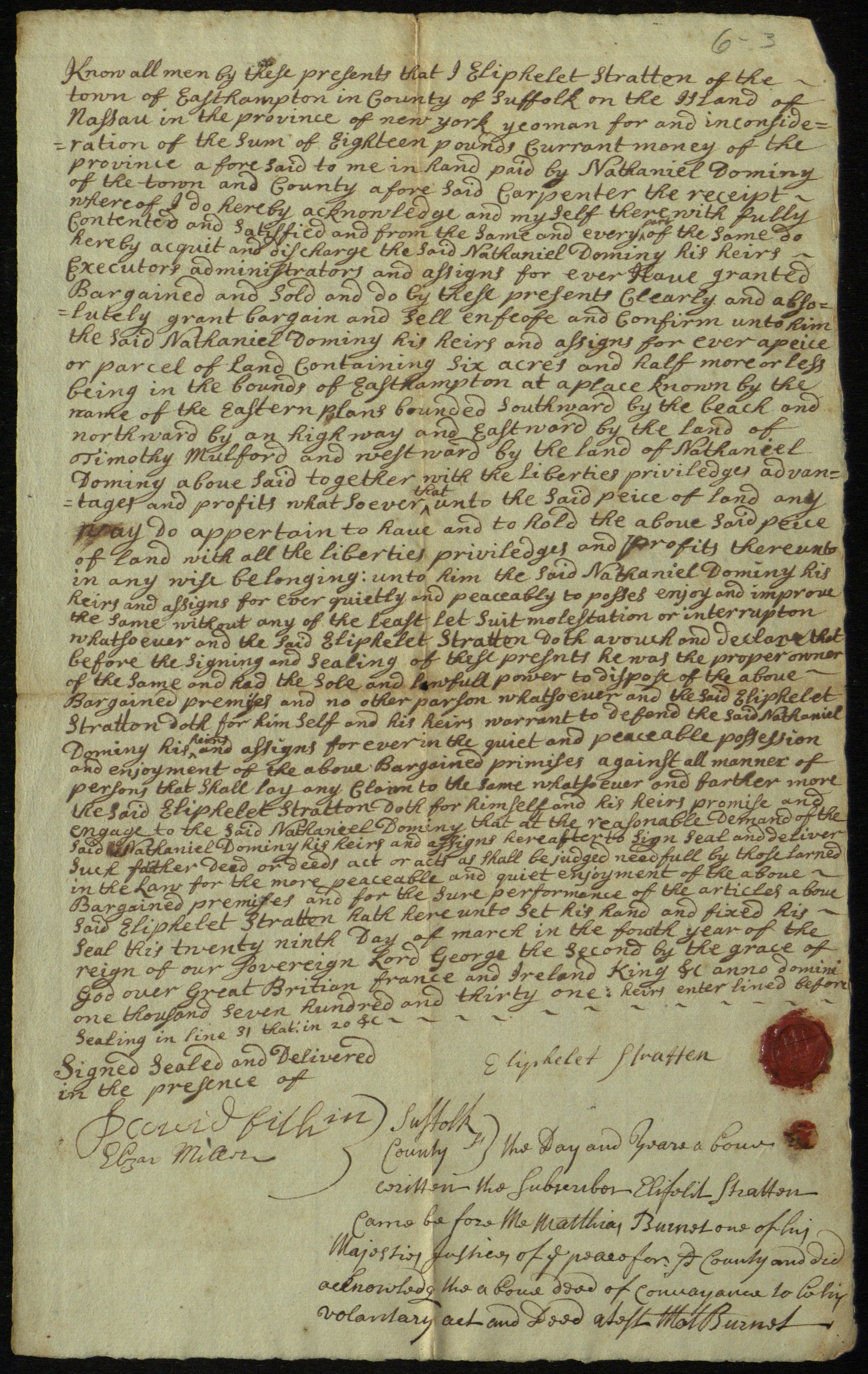 Deed to Nathaniel Dominy : 6 1/2 acres at Eastern Plains, March 29, 1731. [Bounded by beach, highway, Timothy Mulford & Nathaniel Dominy].