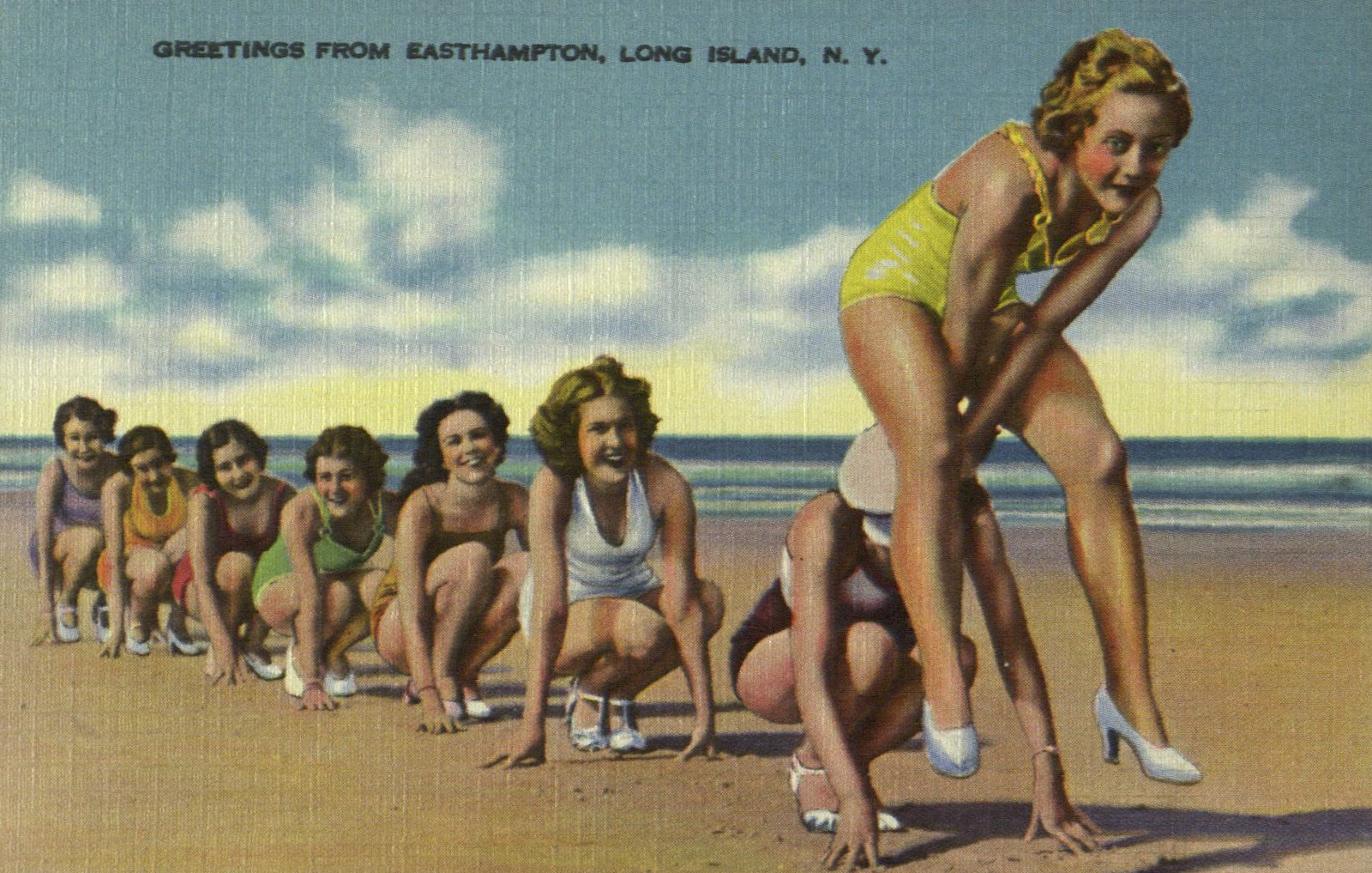 Postcard image of bathing beauties at the beach, in East Hampton, L.I.