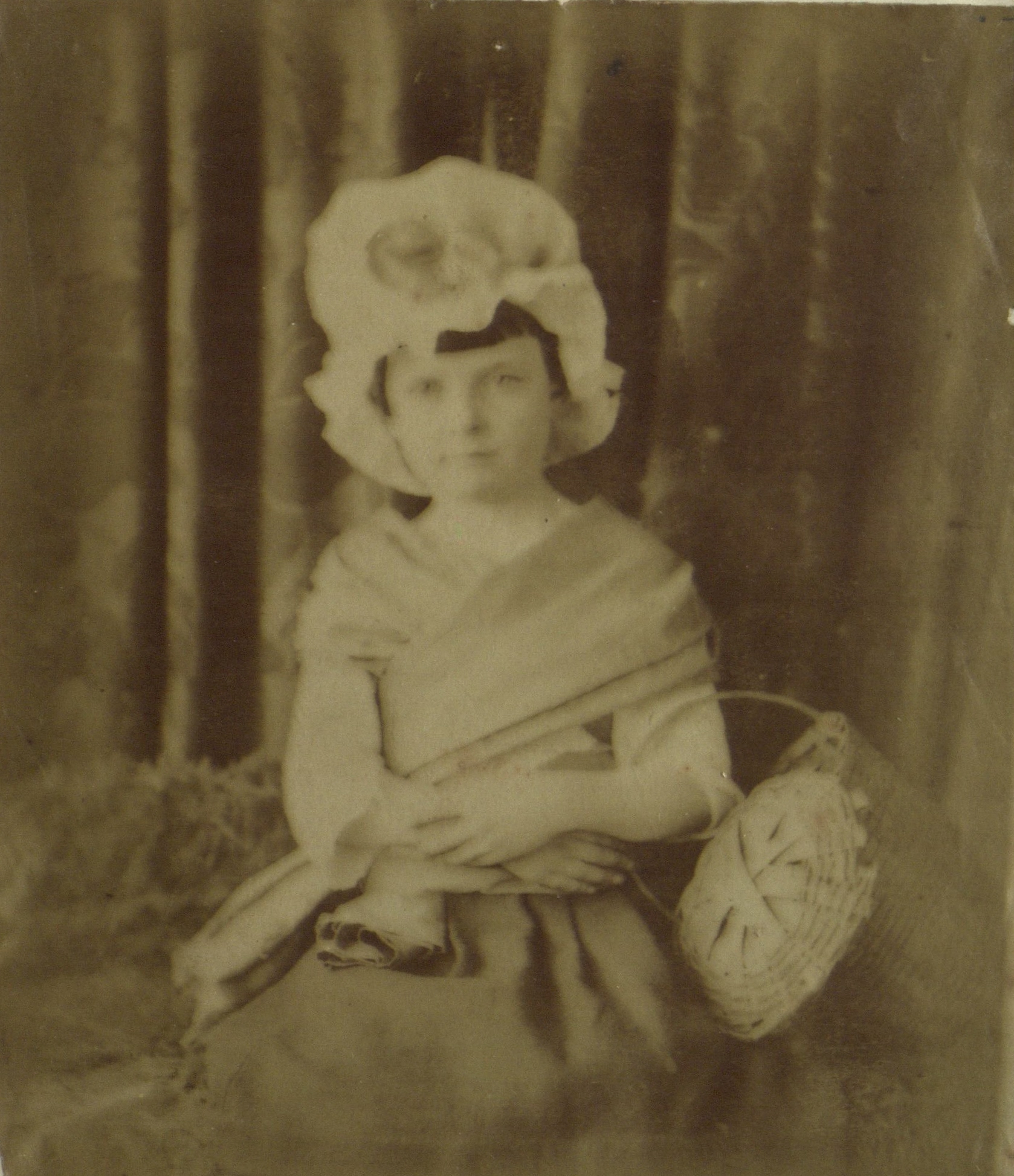 Original photograph of Ruth B. Moran holding a basket, wearing a fluffy hat, at age 6, 1876.