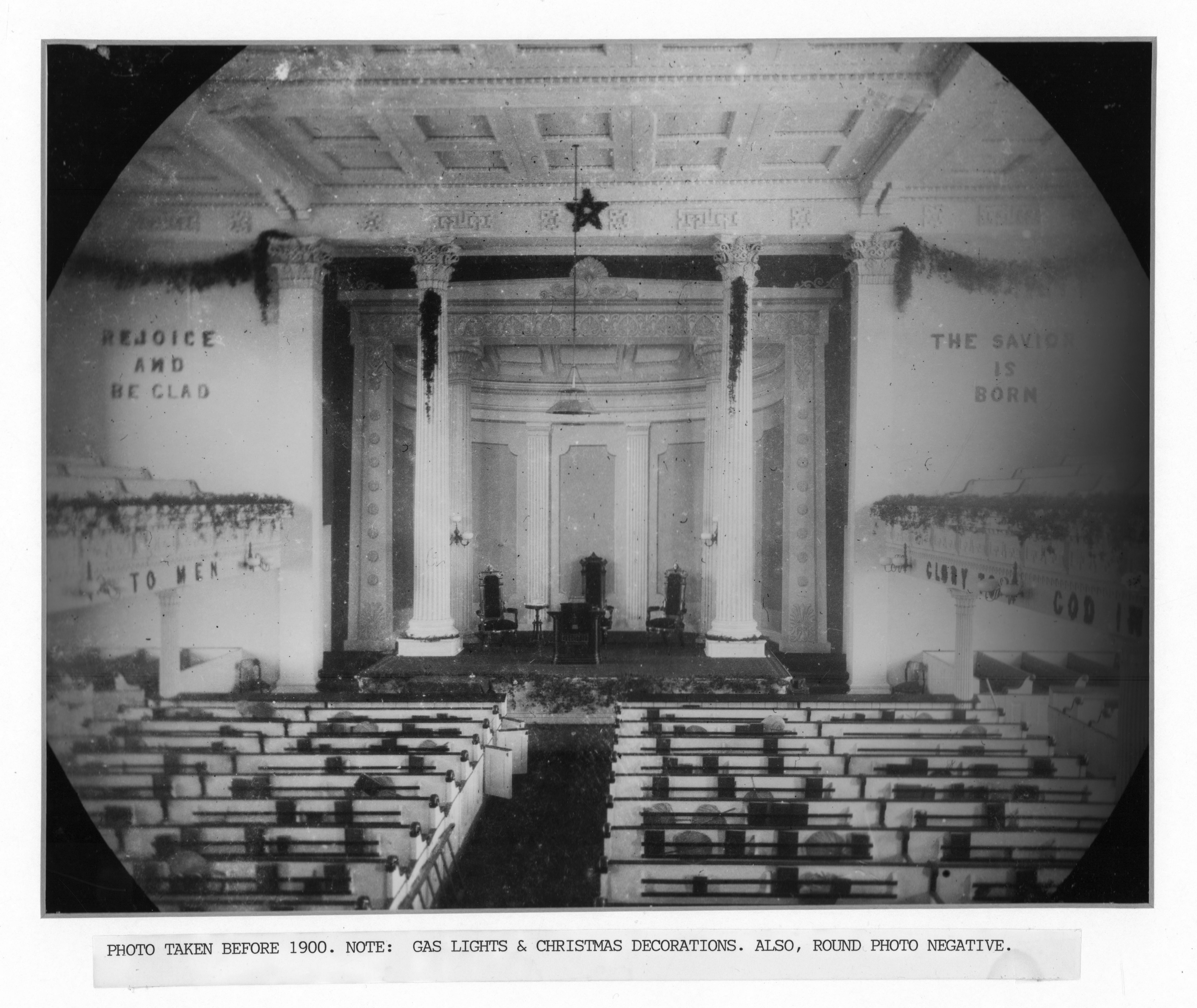 This view looks from the back of the church, probably under the organ, towards the altar. A date is estimated based on the use of round style photos, which were popular in the 1870s and 1880s. The gaslights would have also been popular during that time and a little later. This image shows the interior of the church in December, with Christmas decorations. Some of the Minard Lafever architectural details are visible, too.