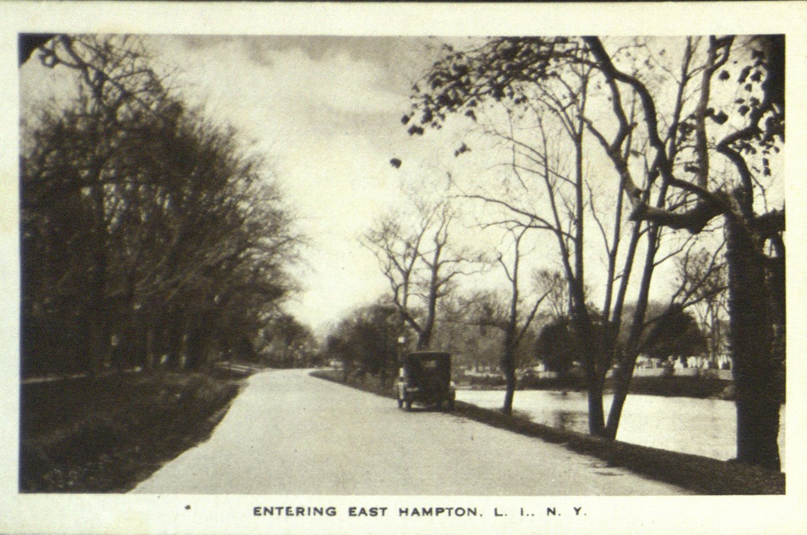 Postcard image depicts view entering East Hampton, L.I.