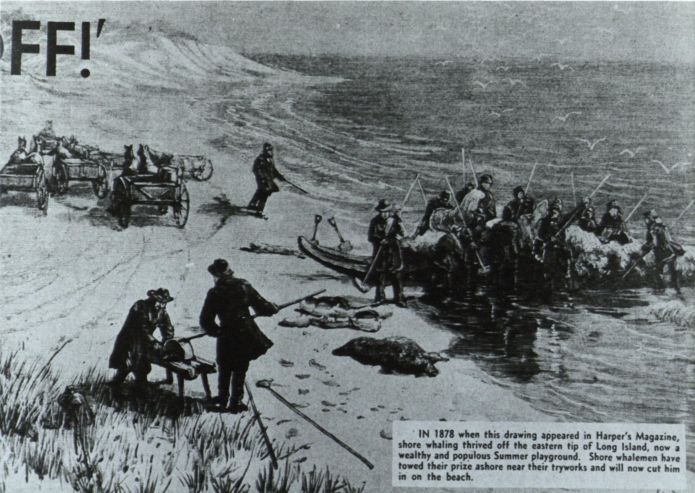 View of Shore Whalemen towing their whale ashore near their tryworks getting ready to cut him on the beach, off the eastern tip of Long Island. From Harper's Magazine, 1878. Illustration used in 1956 edition of Whale Off!, p. 232.