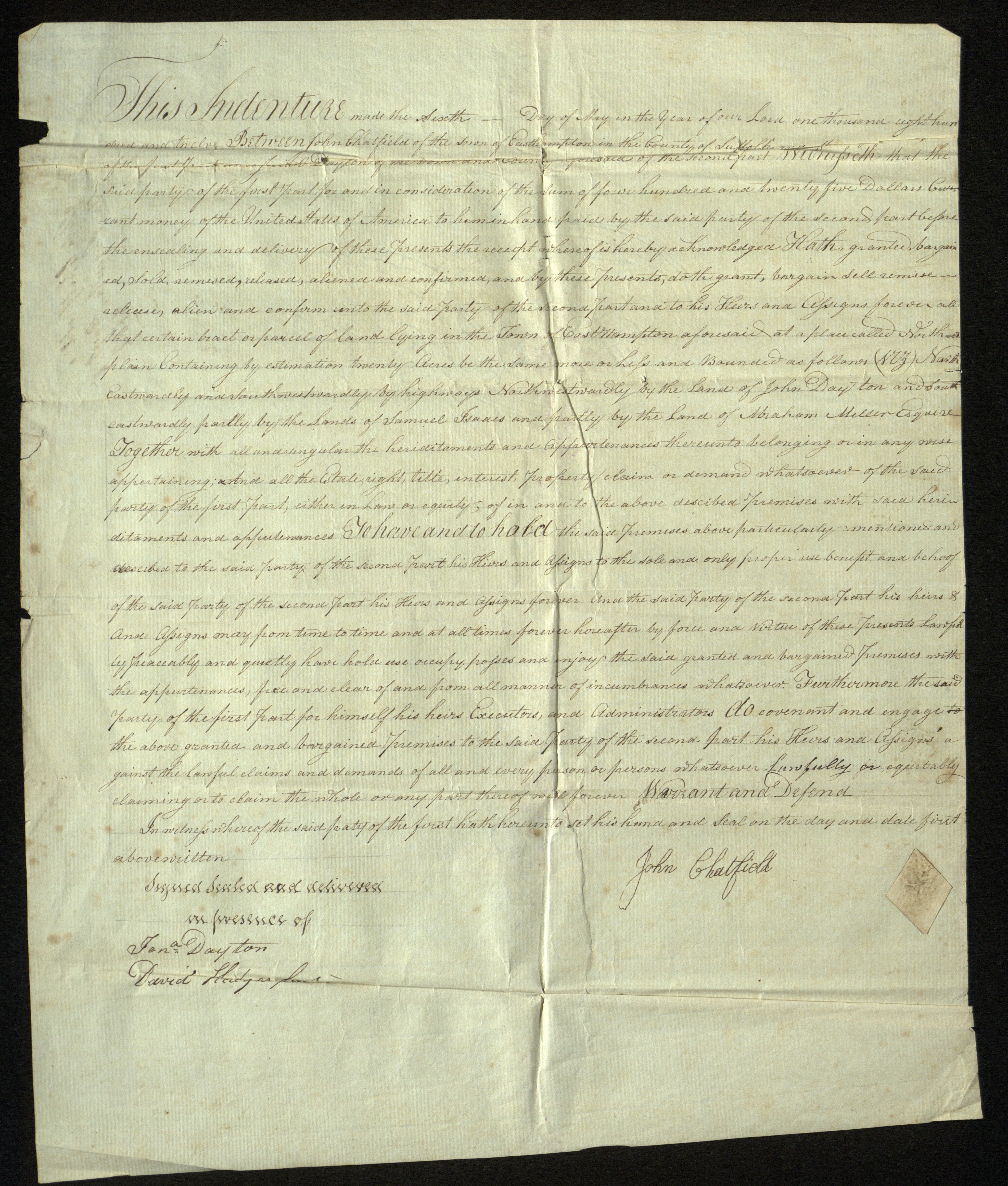 Deed for a parcel of 20 acres of land, in East Hampton, N.Y., at a place called Northwest, May 6, 1812.