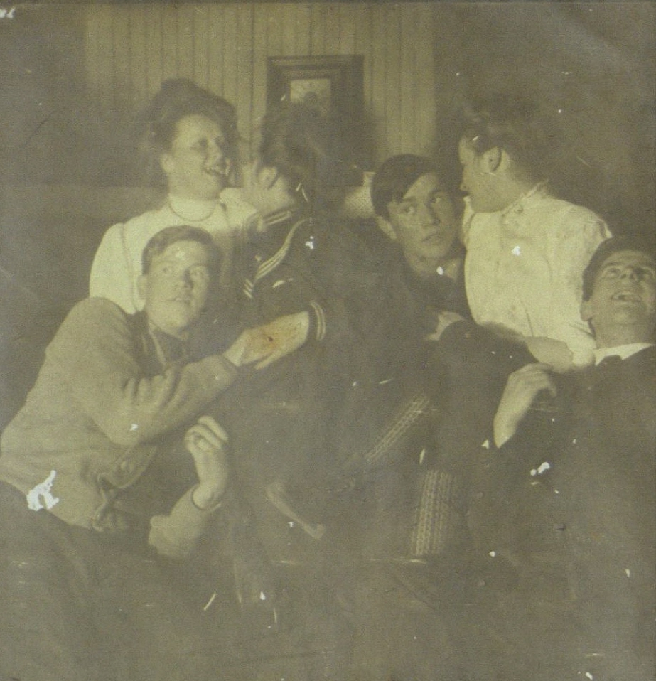 Nelson C. Osborne with J.H. Mulford, Sybil Dominy, Addie Sherrill, and two unidentified friends, taken in the Sherrill house, in East Hampton, L.I.