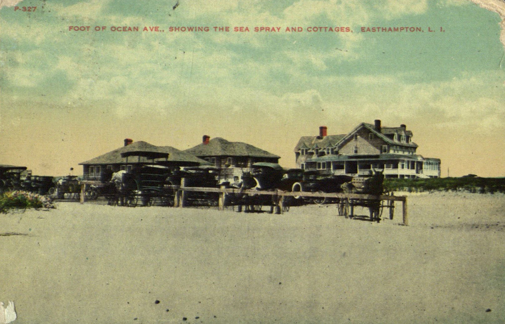 Postcard image of the foot of Ocean Avenue, showing The Sea Spray and cottages, in East Hampton, L.I.