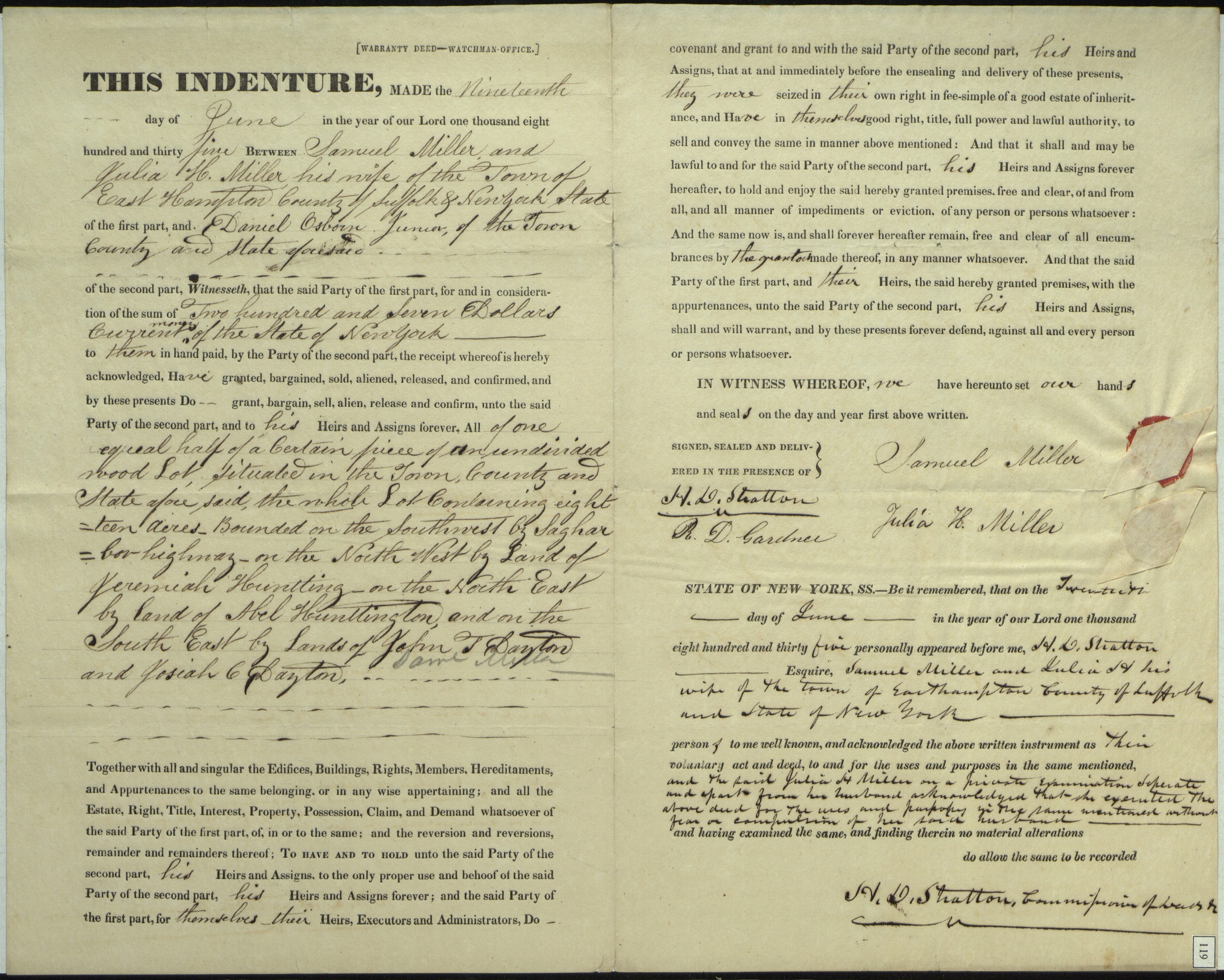 Sale of parcel of undivided wood lot, in East Hampton Township, N.Y., by Samuel Miller, and his wife, Julia H. Miller, to Daniel Osborn, Jr.; June 19, 1835. 9 acre tract, being half of an undivided wood lot, bounded on the southwest by Sag Harbor Highway and on the northwest by land of Jeremiah Huntting; witnessed by H.D. Stratton and R.D. Gardiner. Warranty deed form printed by the Watchman Office (newspaper publisher in Sag Harbor, N.Y.).