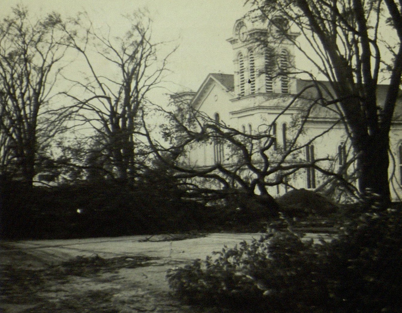 View of downed trees by the Presbyterian church, after the hurricane of 1938.